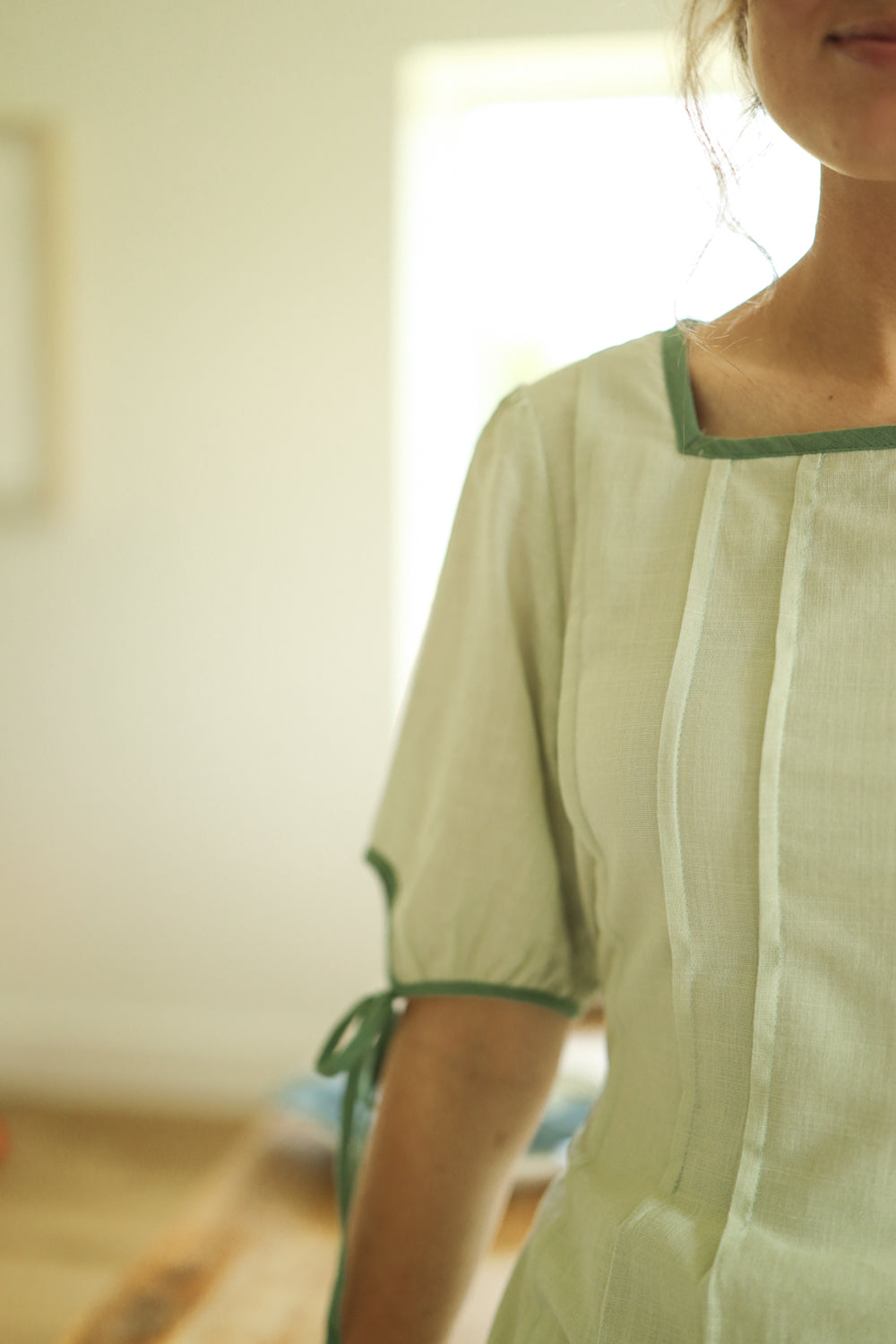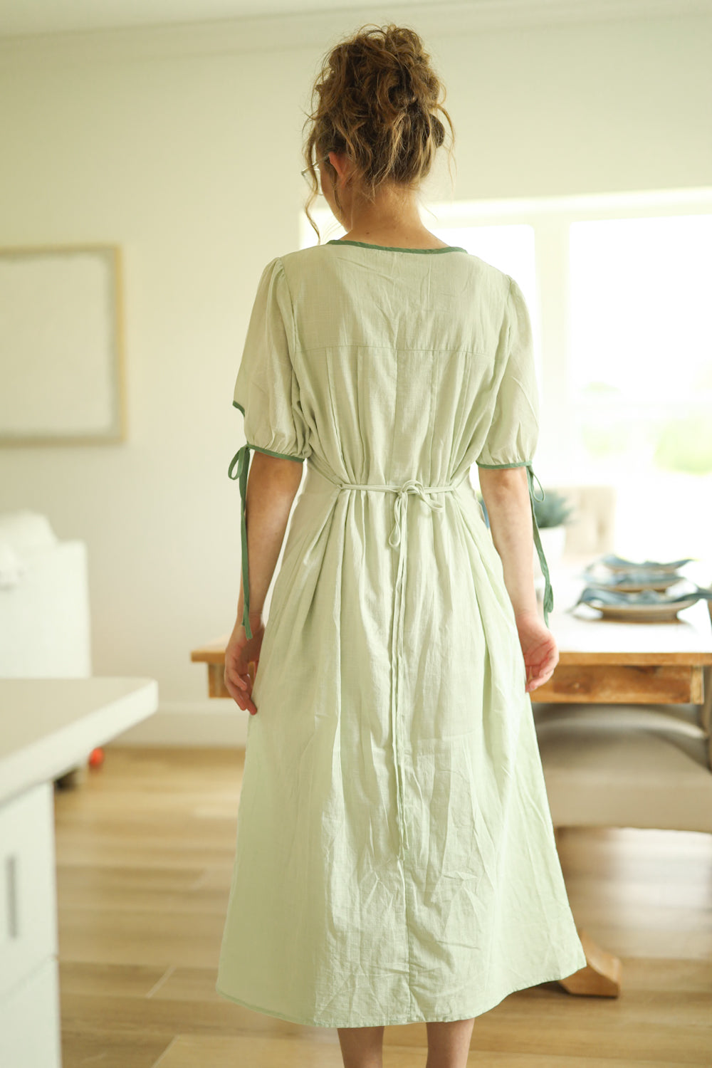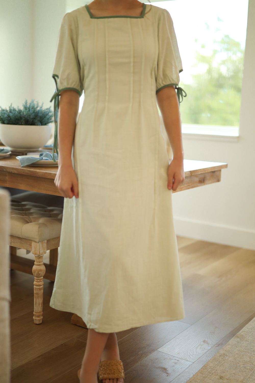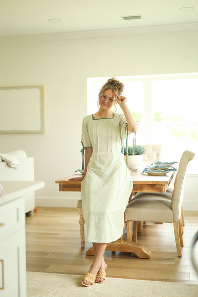 Regular price $57.99The Meadow Dress is a lovely addition to your wardrobe, featuring contrasting fabric with a modest square neckline and short sleeves finished with charming tie details. The bodice is accented with simple pintuck details, and a removable waist tie allows for a comfortable, flattering fit. Practical pockets add extra convenience. This lined, midi-length dress is an excellent choice for all your summer occasions.