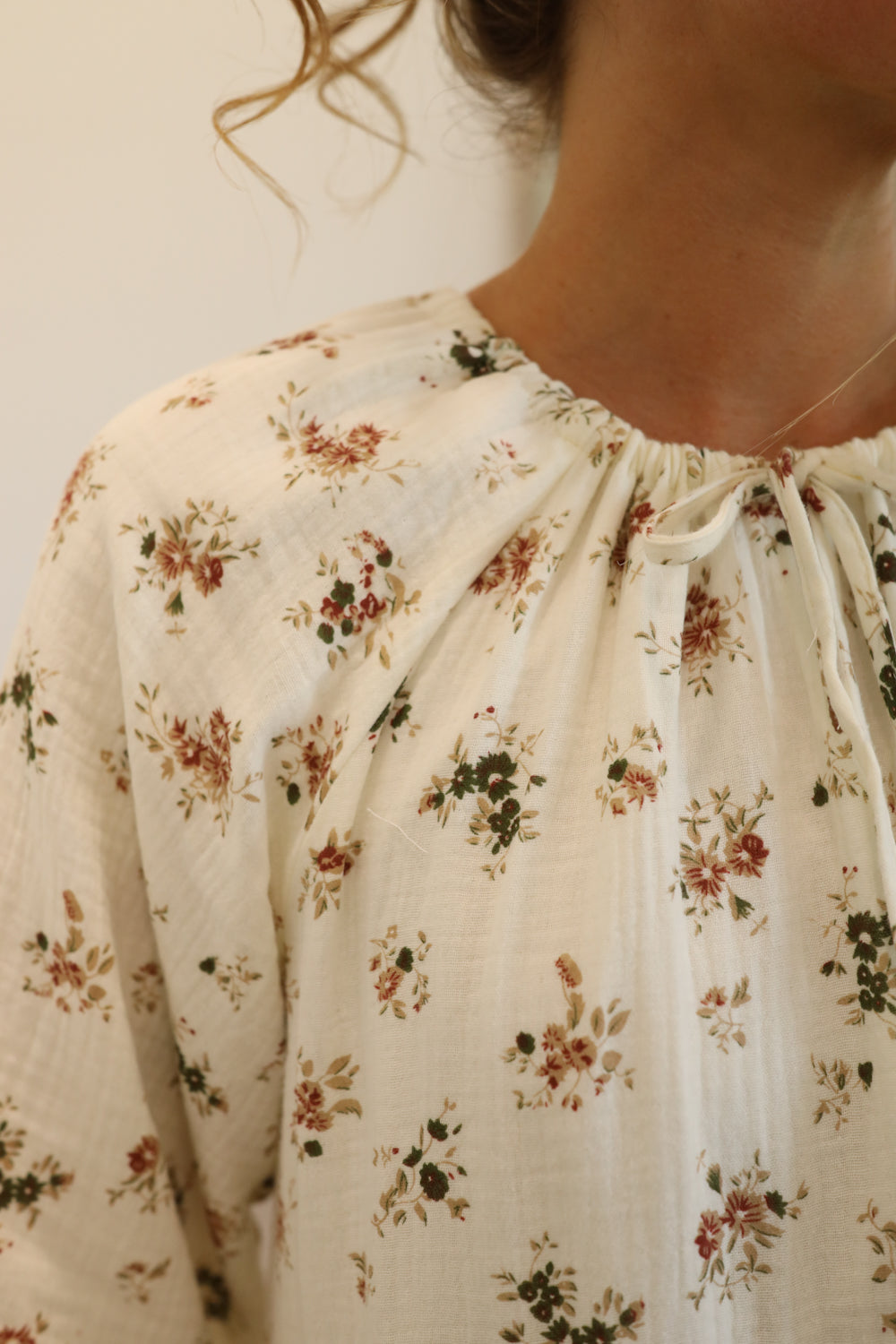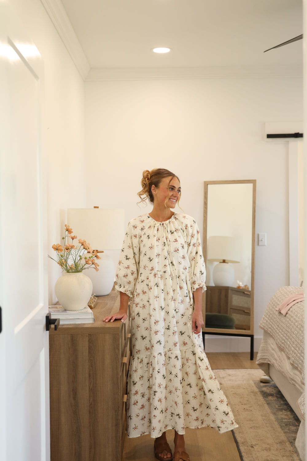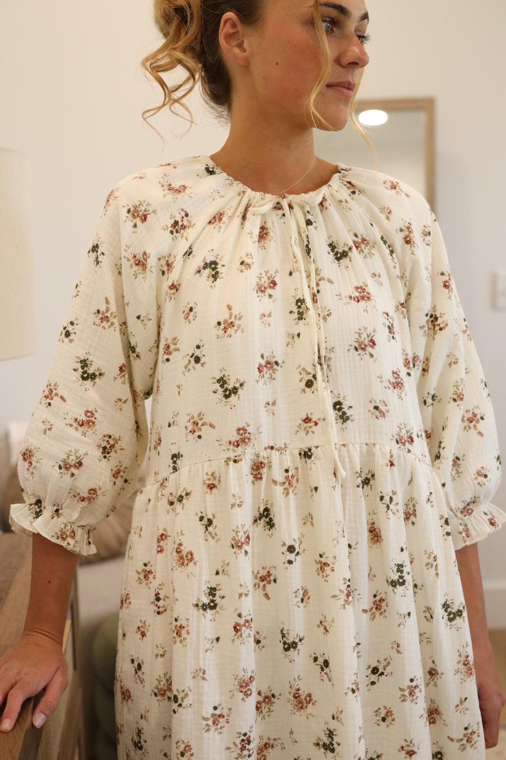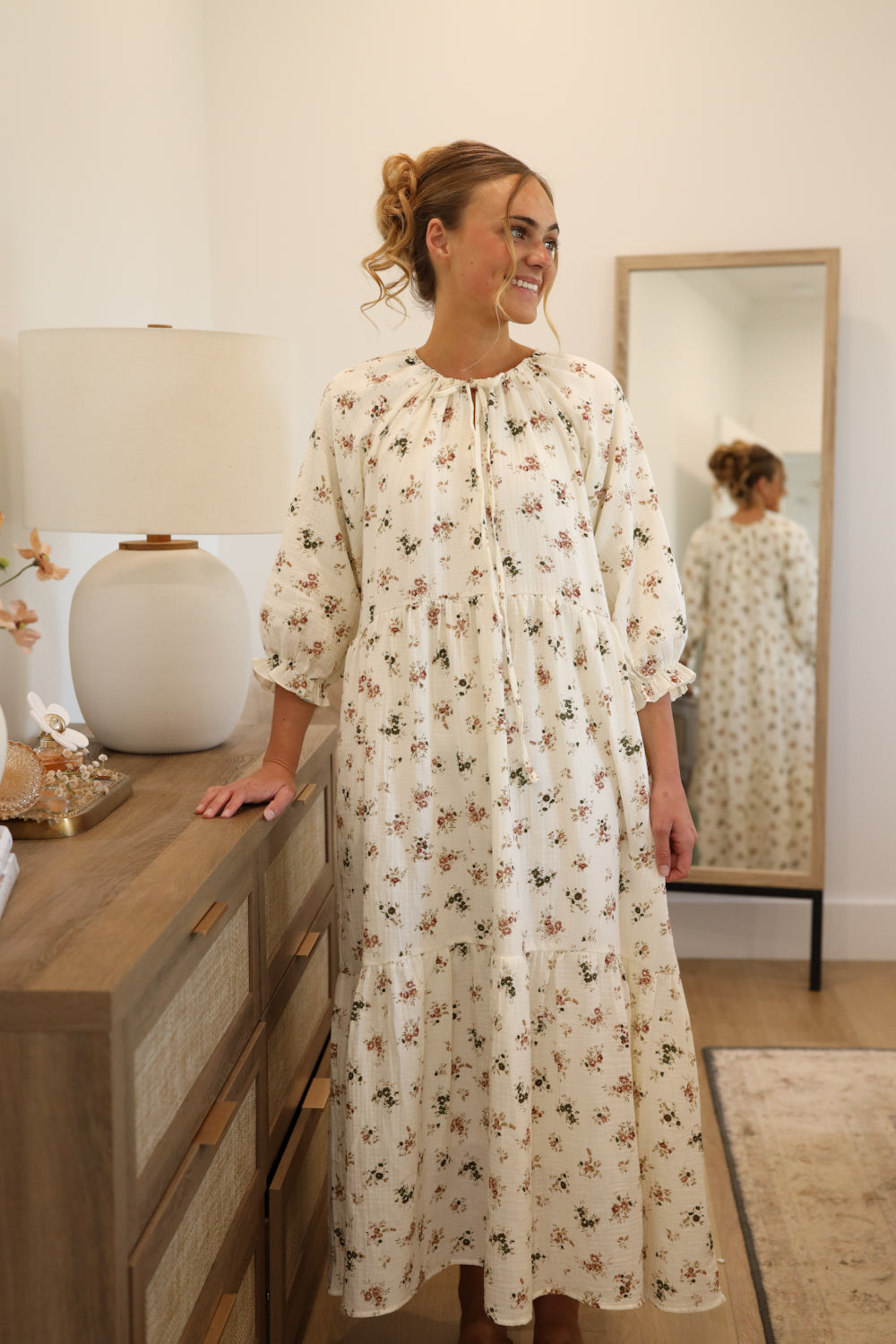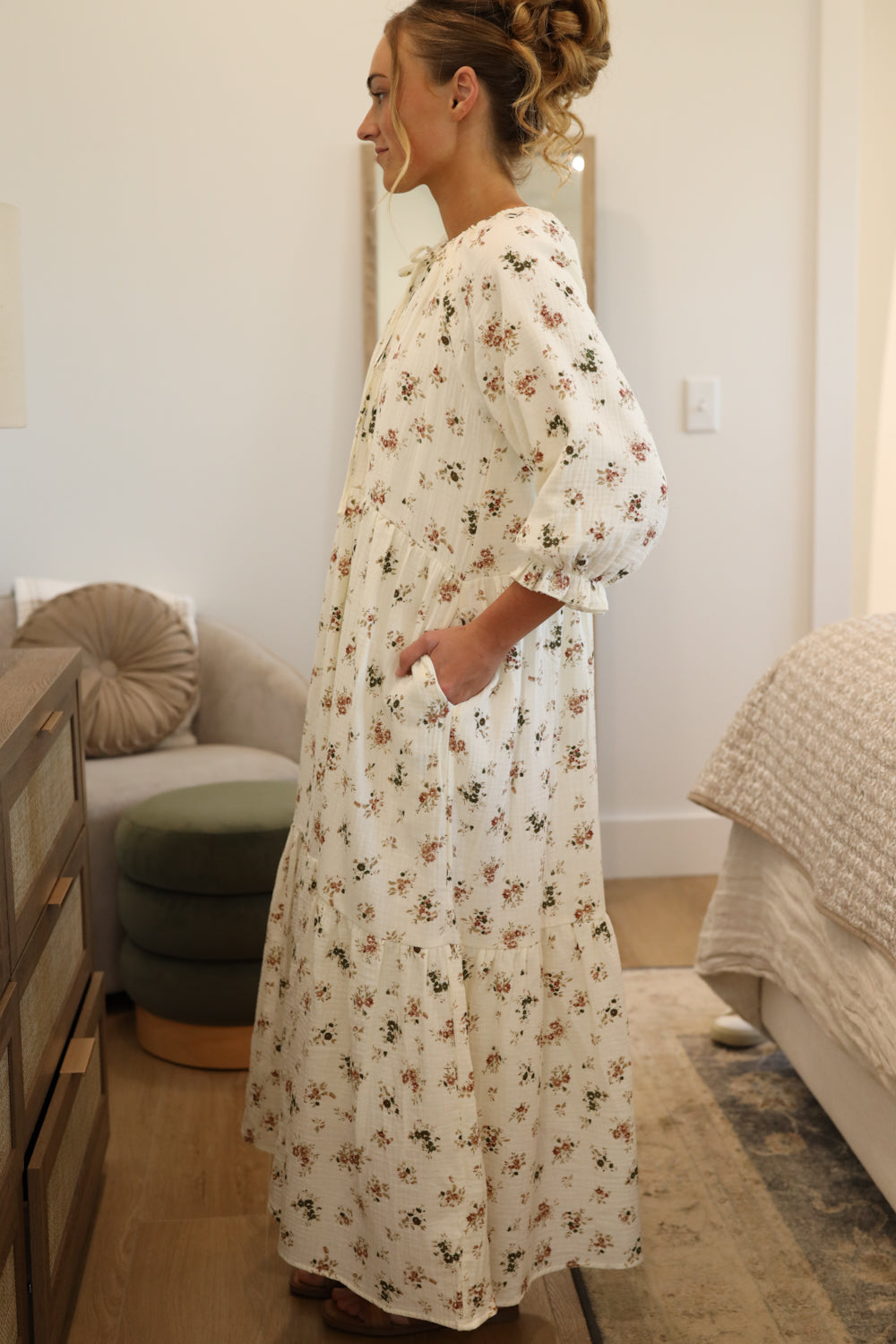 Our Blakely Dress combines effortless style with thoughtful details. Crafted from lightweight gauze, this maxi features an adjustable tie neckline you can customize to your preference, a flattering high waistline ideal for expectant mothers, and 3/4 sleeves with elastic cuffs and ruffle accents. The tiered silhouette provides graceful movement, while practical pockets and full lining add everyday functionality. Perfect for casual outings with friends or relaxed gatherings.