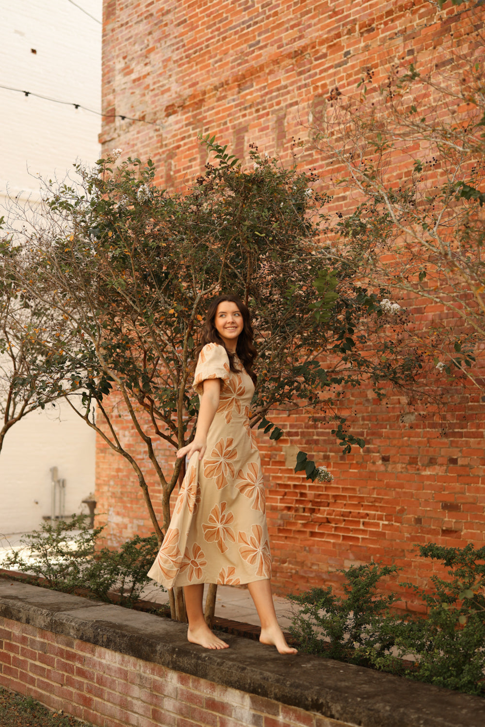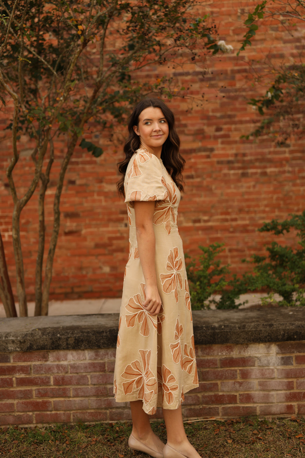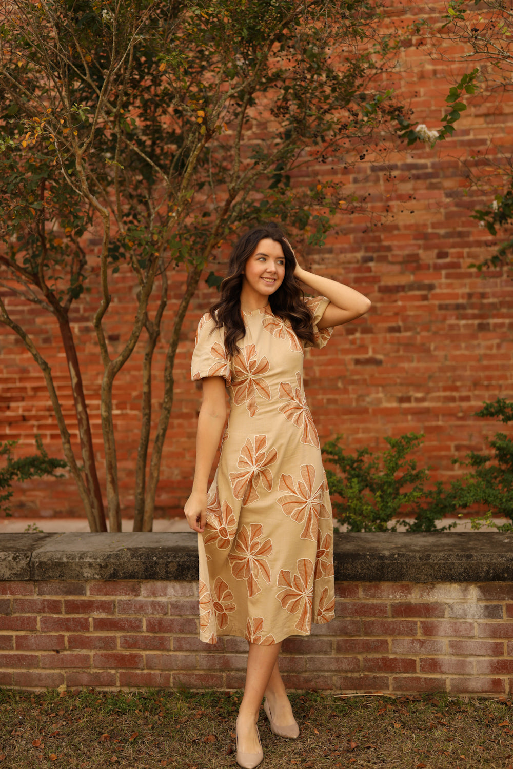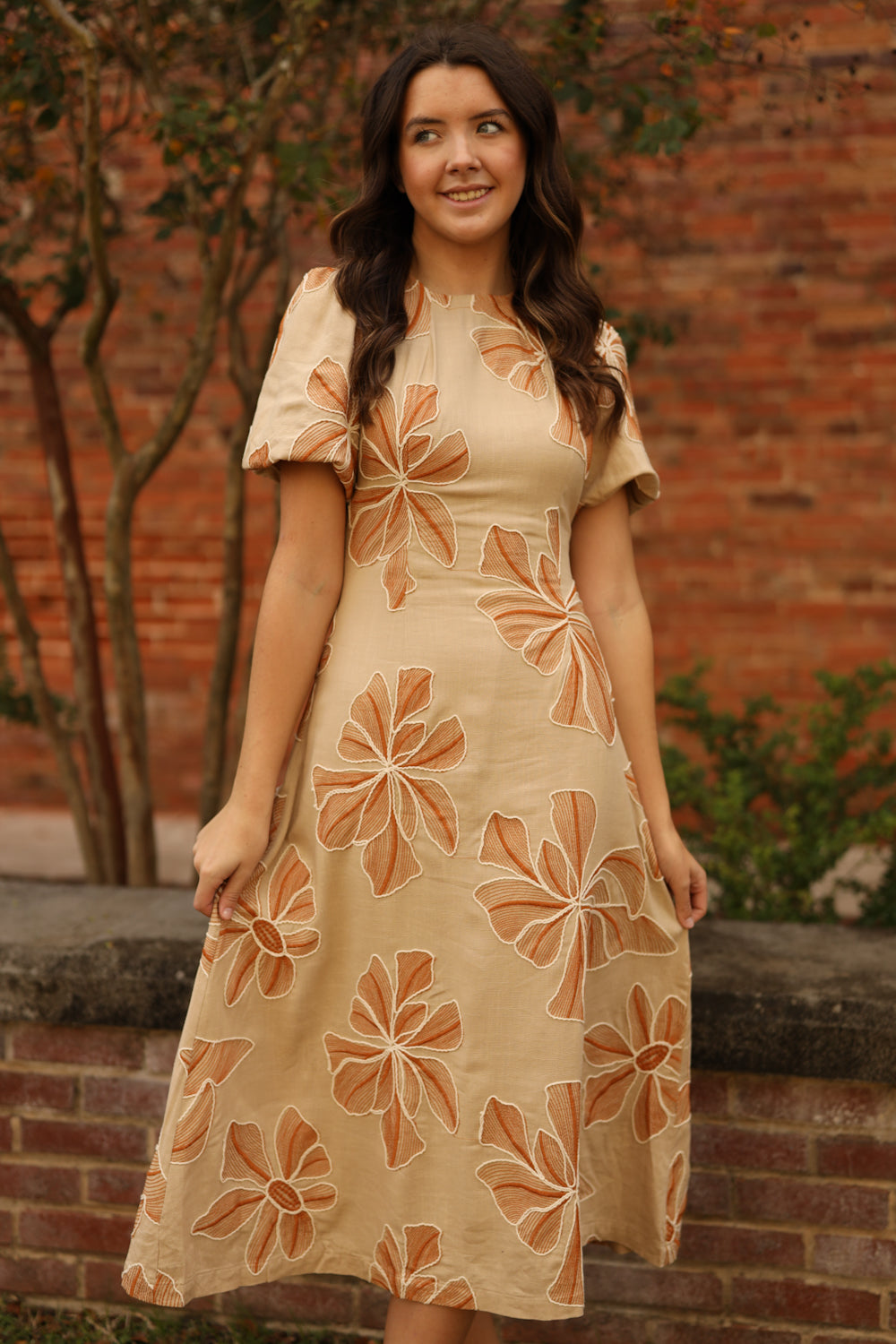 The Beckham Dress is a maxi length stunning piece which showcases a delicate round neckline and charming puff sleeves that add feminine appeal. A back zipper closure ensures a polished fit, while the fully lined construction offers comfort and durability. The dress features a gorgeous embroidered floral motif in cream and burnt orange that blooms across a khaki foundation, creating an eye-catching yet timeless look. Whether you're enjoying casual moments with friends or stepping into professional settings, this dress adapts beautifully—pair it with flats for relaxed days or heels for elevated occasions.