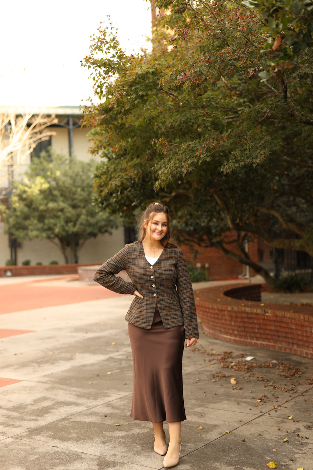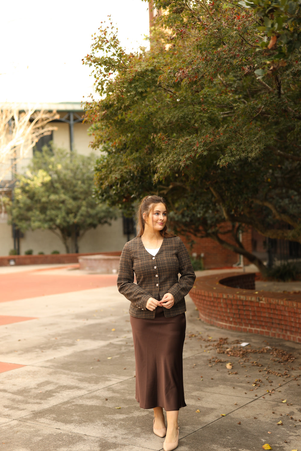 Regular price $51.99The Kristen Blazer showcases a beautiful tweed plaid pattern in rich autumn tones. It offers a flattering V-neck and functional gold buttons along the front. Faux pockets add subtle detail, while gold buttons accent the long sleeves. This blazer is ideal for achieving an elegant, polished look with ease.