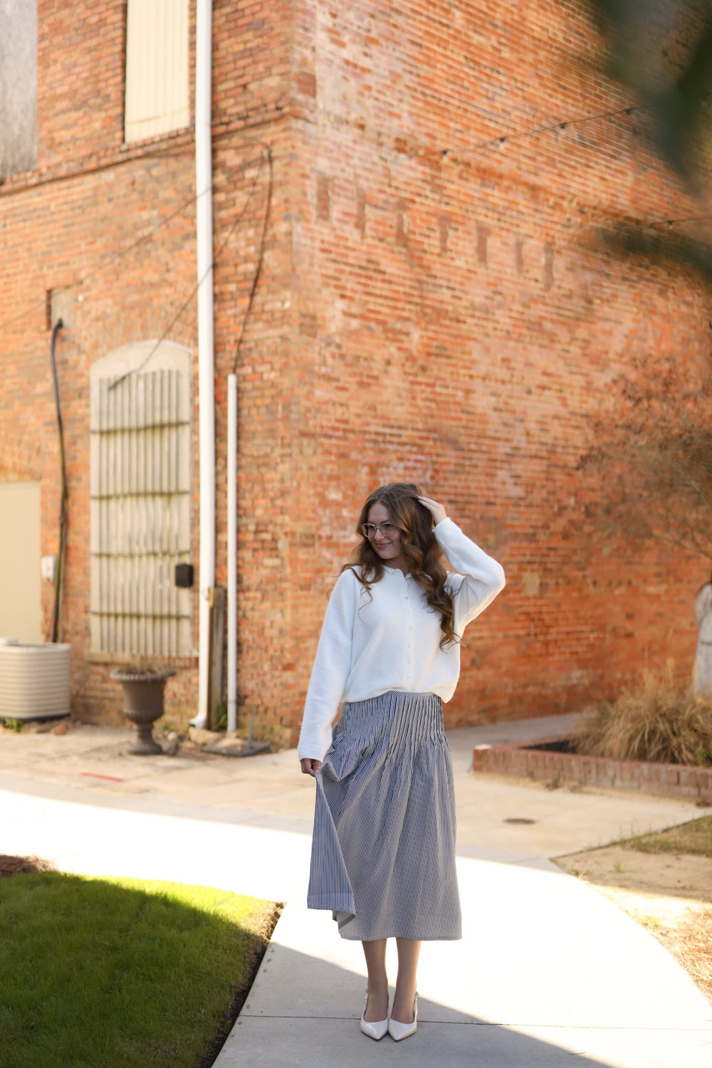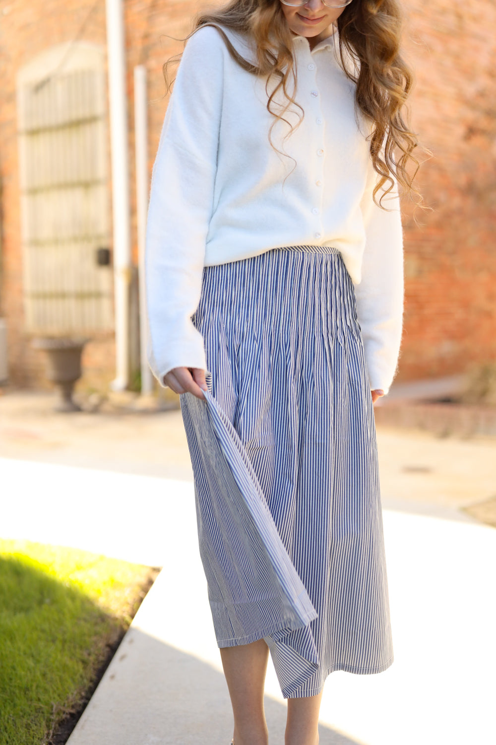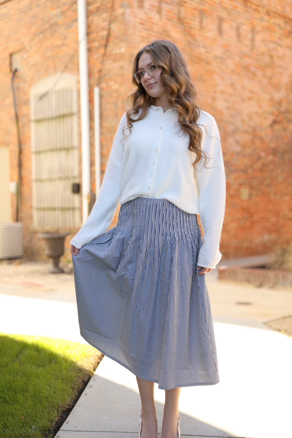 Regular price $51.99The Campbell Skirt brings effortless style to your everyday wardrobe with its classic navy and white stripes. Designed for comfort and versatility, this midi skirt features refined pintuck accents along the hips and dual closures—a side zipper paired with a hook-and-eye fastening—ensuring a secure, flattering fit. Perfect for casual gatherings or relaxed days out, it's the go-to piece you'll reach for again and again.
