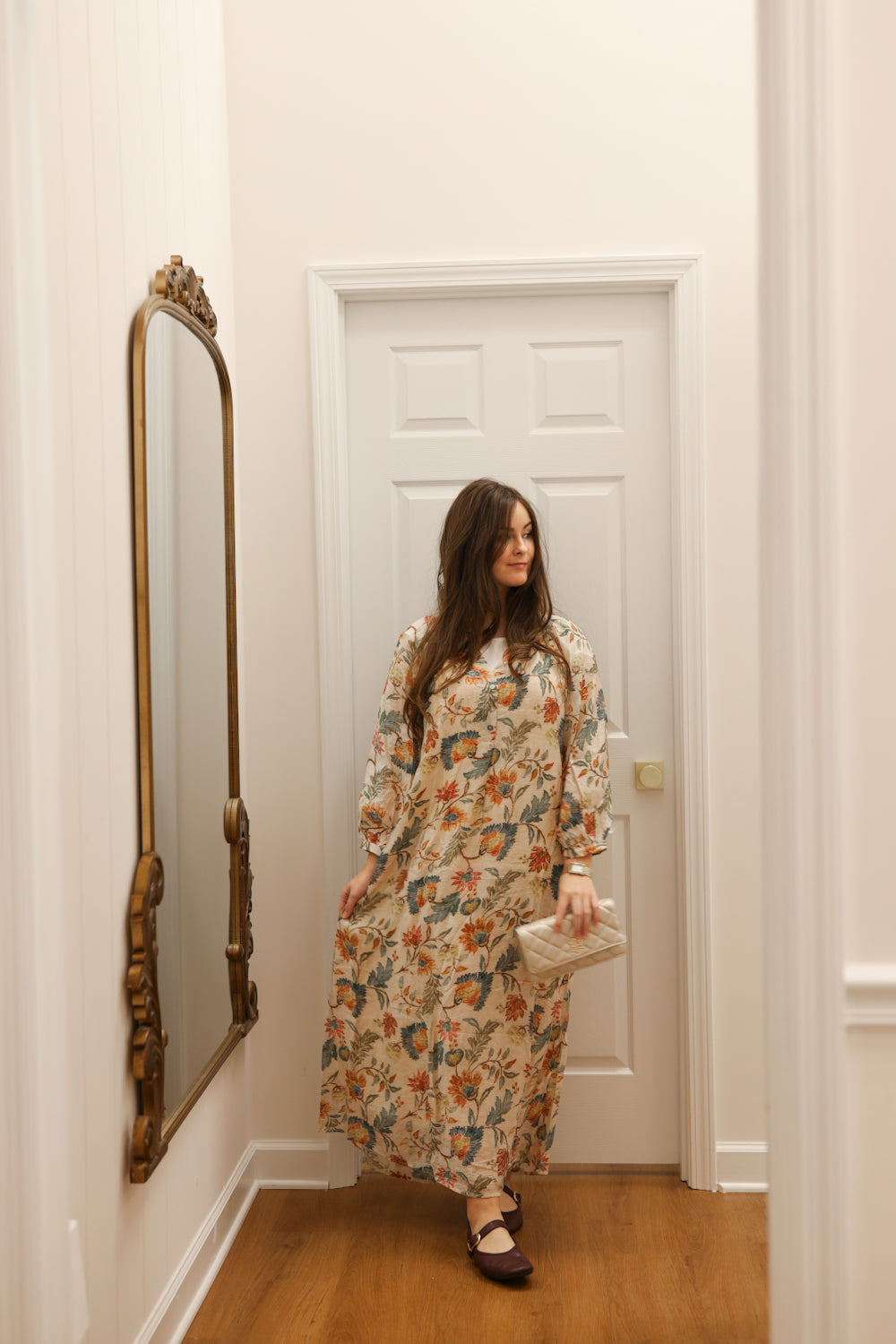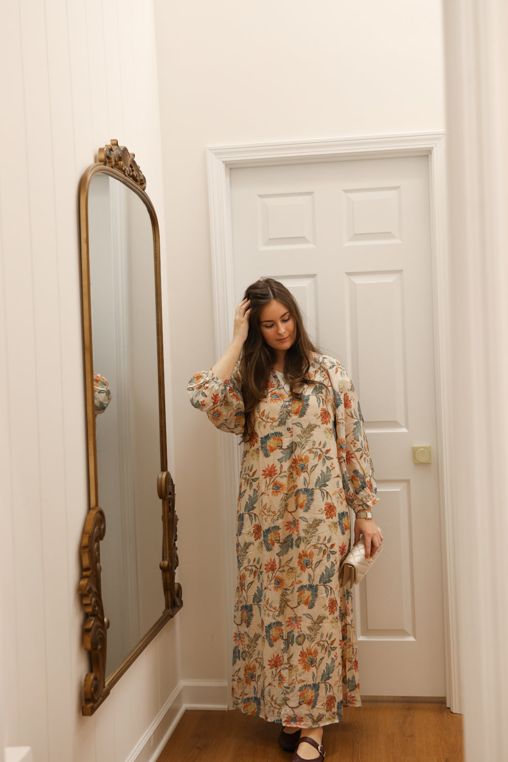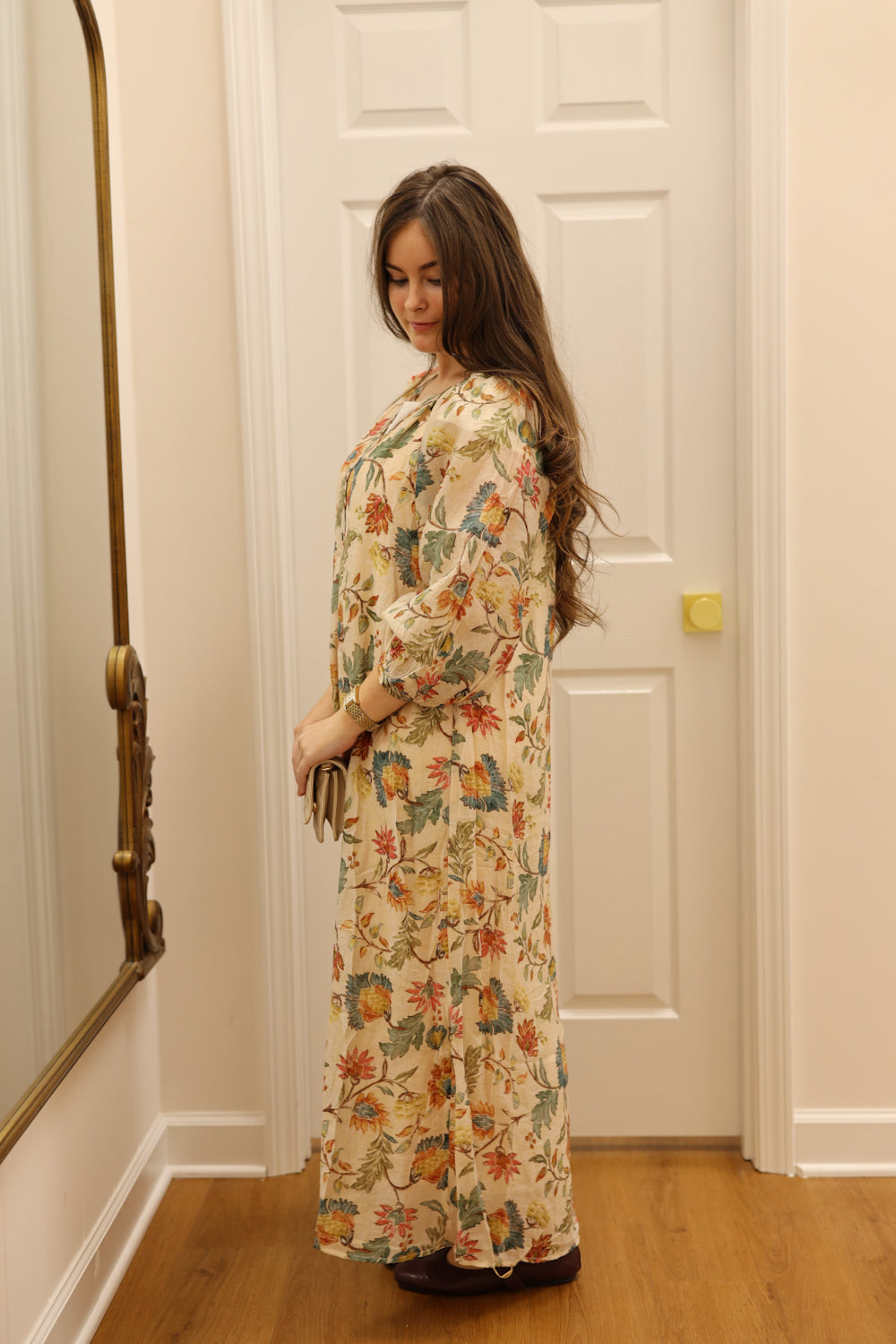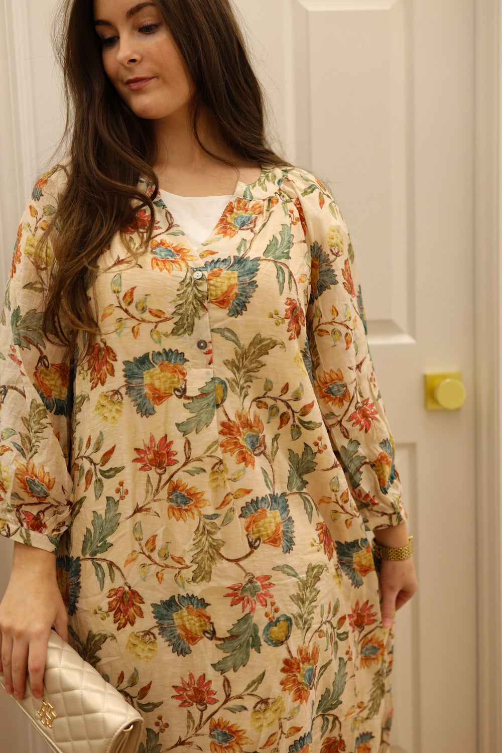Regular price $57.99The Brooks Dress is a charming dress featuring a floral print set against a neutral beige and ecru canvas. This maxi dress brings effortless sophistication to your everyday wardrobe. The V-neckline and functional button front make it nursing-friendly, while the intentionally spacious, relaxed fit provides comfort and freedom of movement. Long sleeves finished with button cuffs offer styling flexibility. The lined construction adds quality and ensures the dress drapes beautifully. This versatile style gives a comfortable fit, whether you're spending a relaxed evening with loved ones or simply embracing a more laid-back aesthetic.