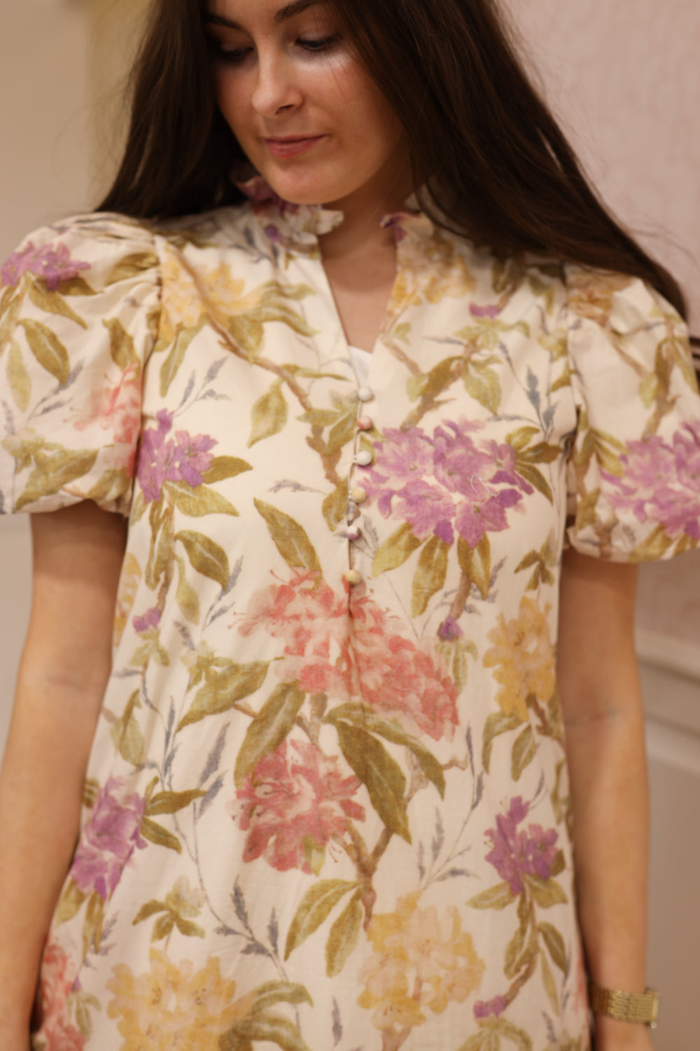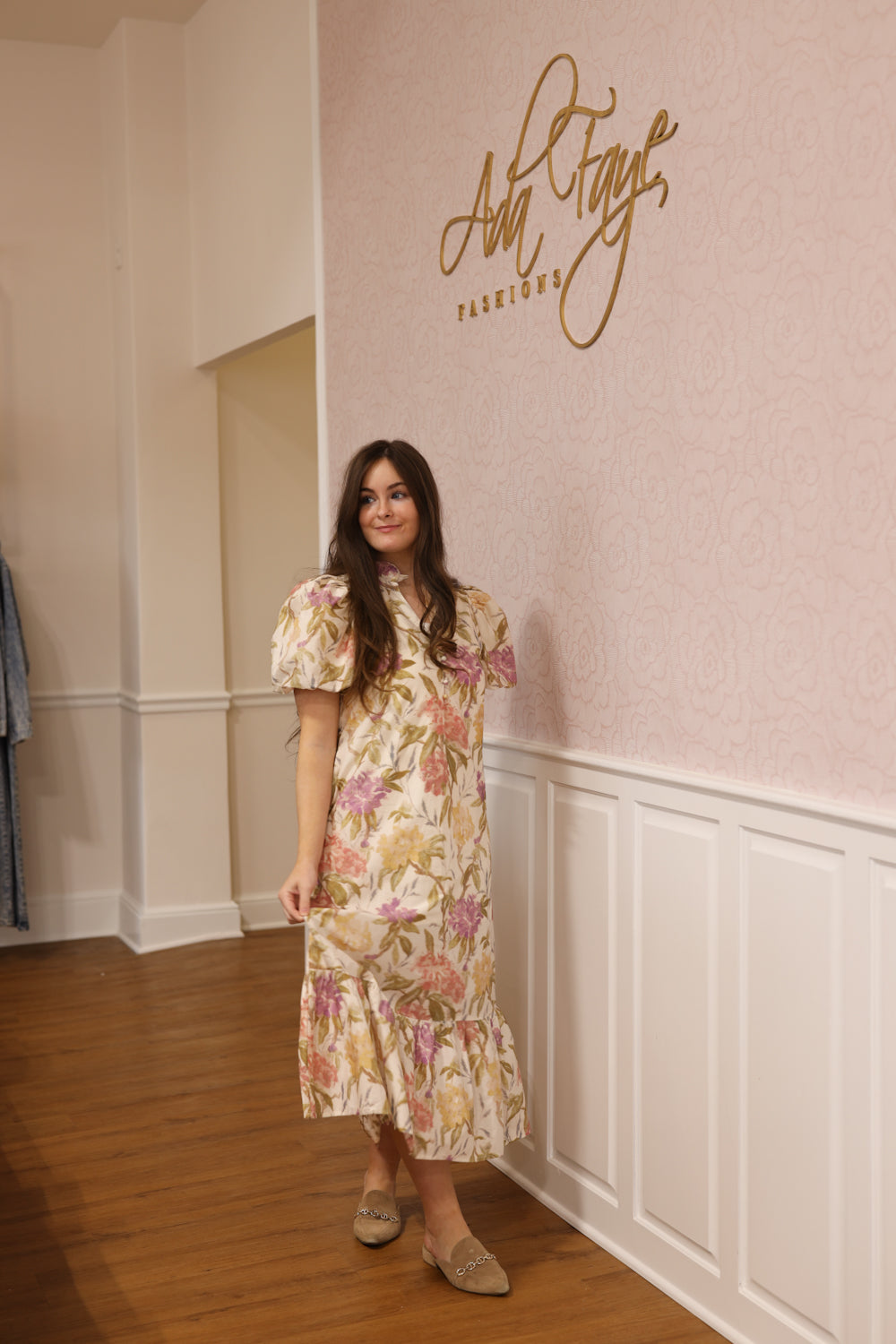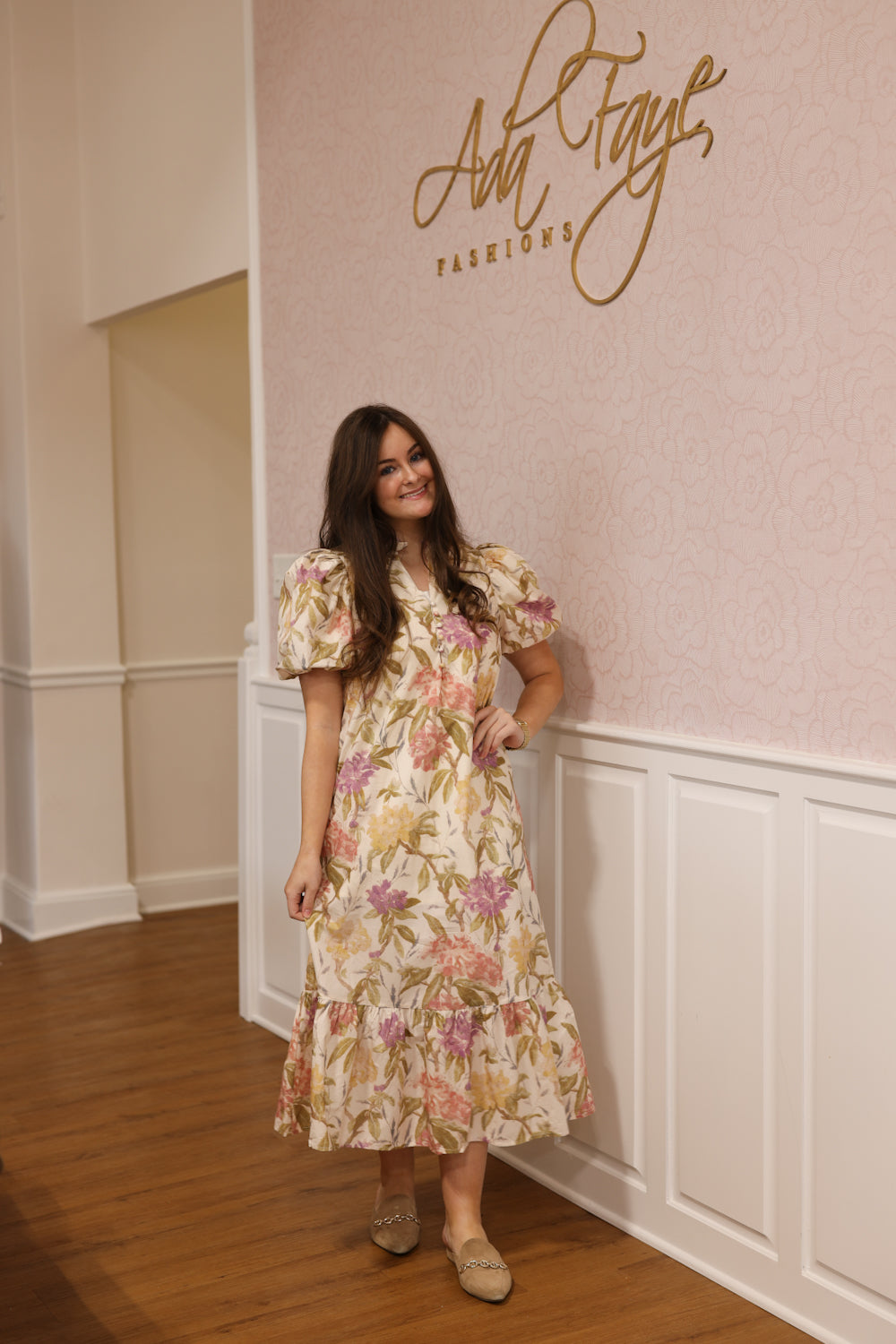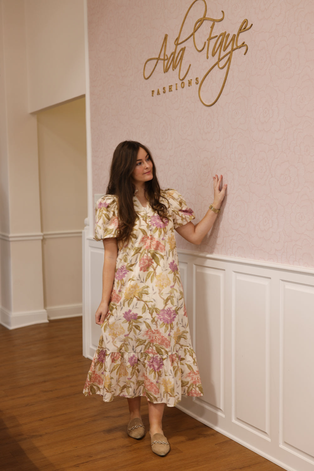 Regular price $53.99Say hello to the Viola Dress—your new wardrobe essential that actually gets you! Colorful florals bloom across creamy fabric while ruffled edges frame a flattering V-neckline. Nursing-friendly buttons on the bodice mean you can style and function at the same time. Puff sleeves whisper charm, functional pockets hide your essentials, and a ruffled hem adds the perfect playful finish. Perfect for those days when you need a dress that keeps up with your life—whether that's chasing toddlers or chasing sunshine.
