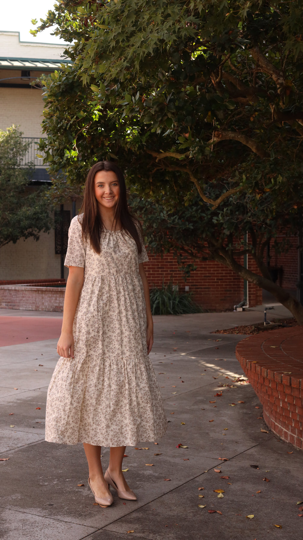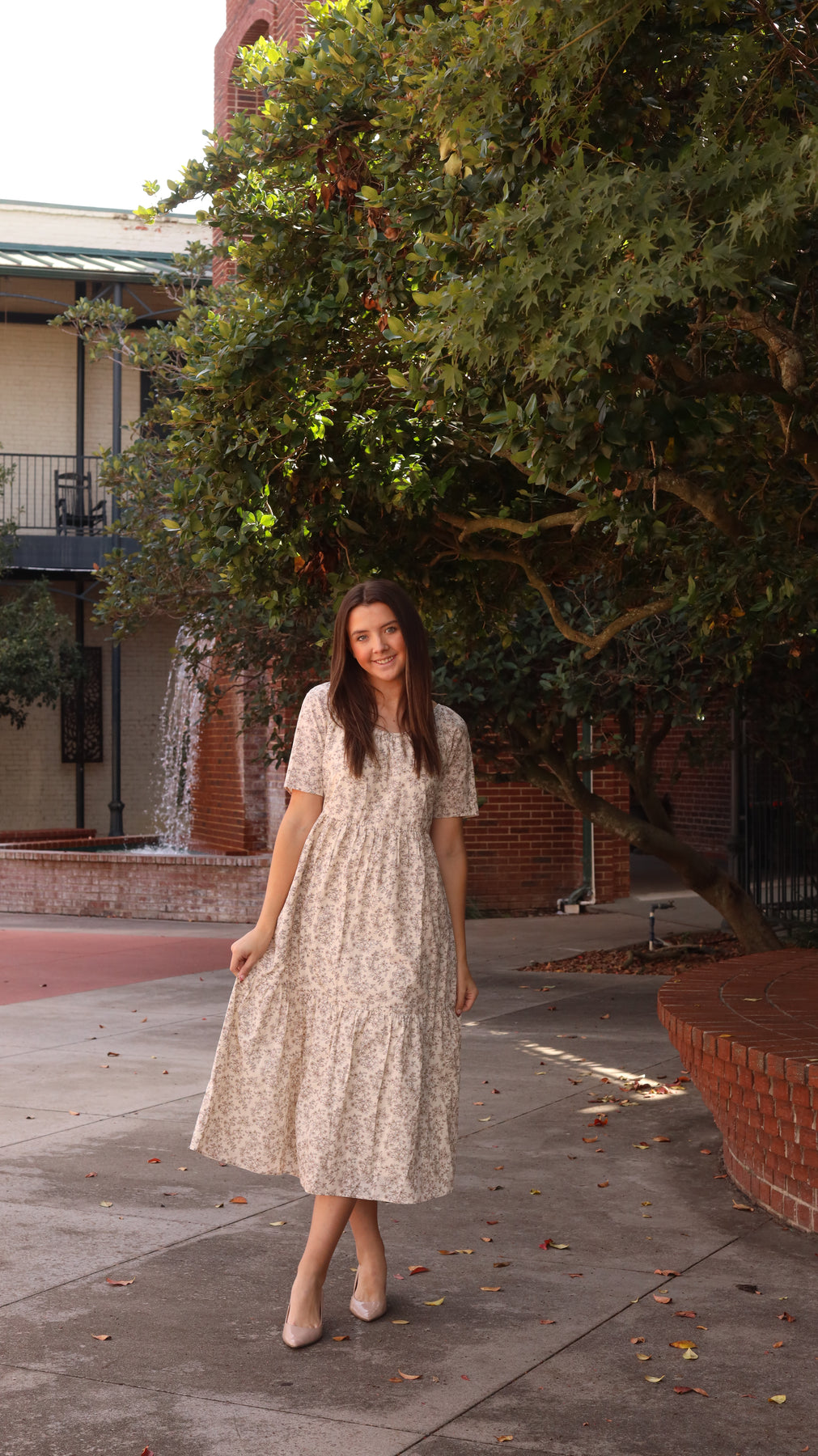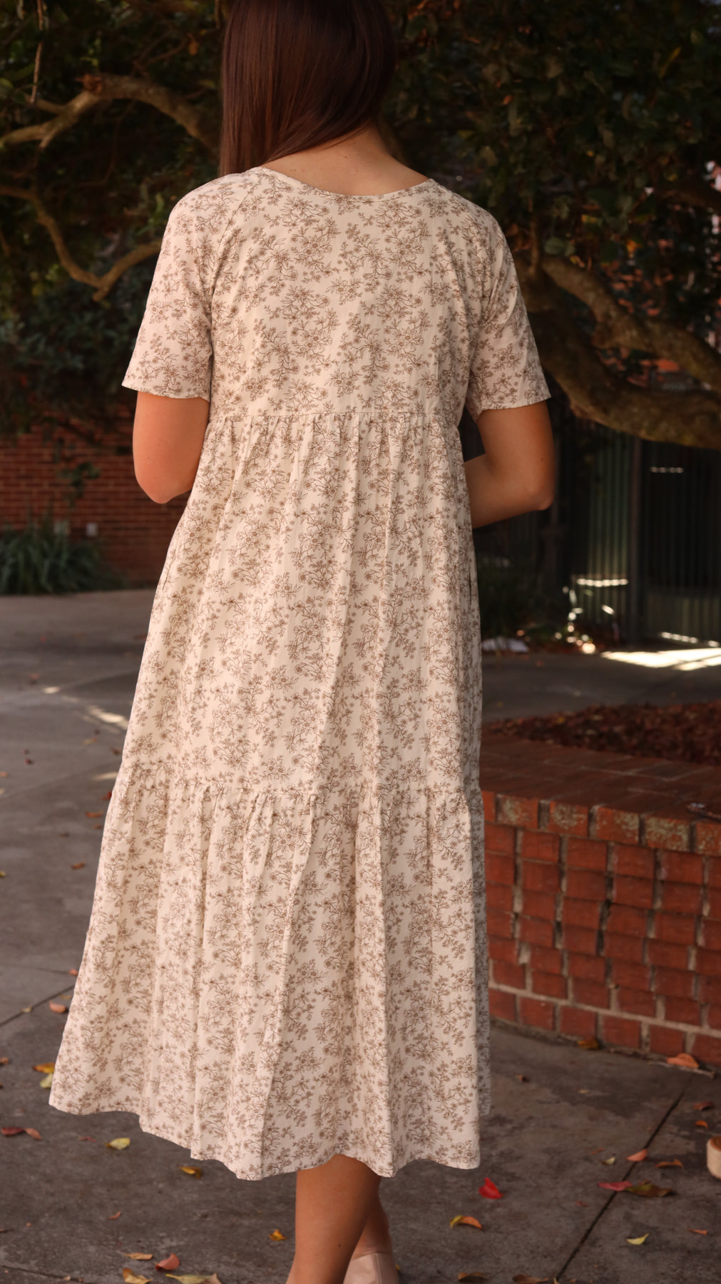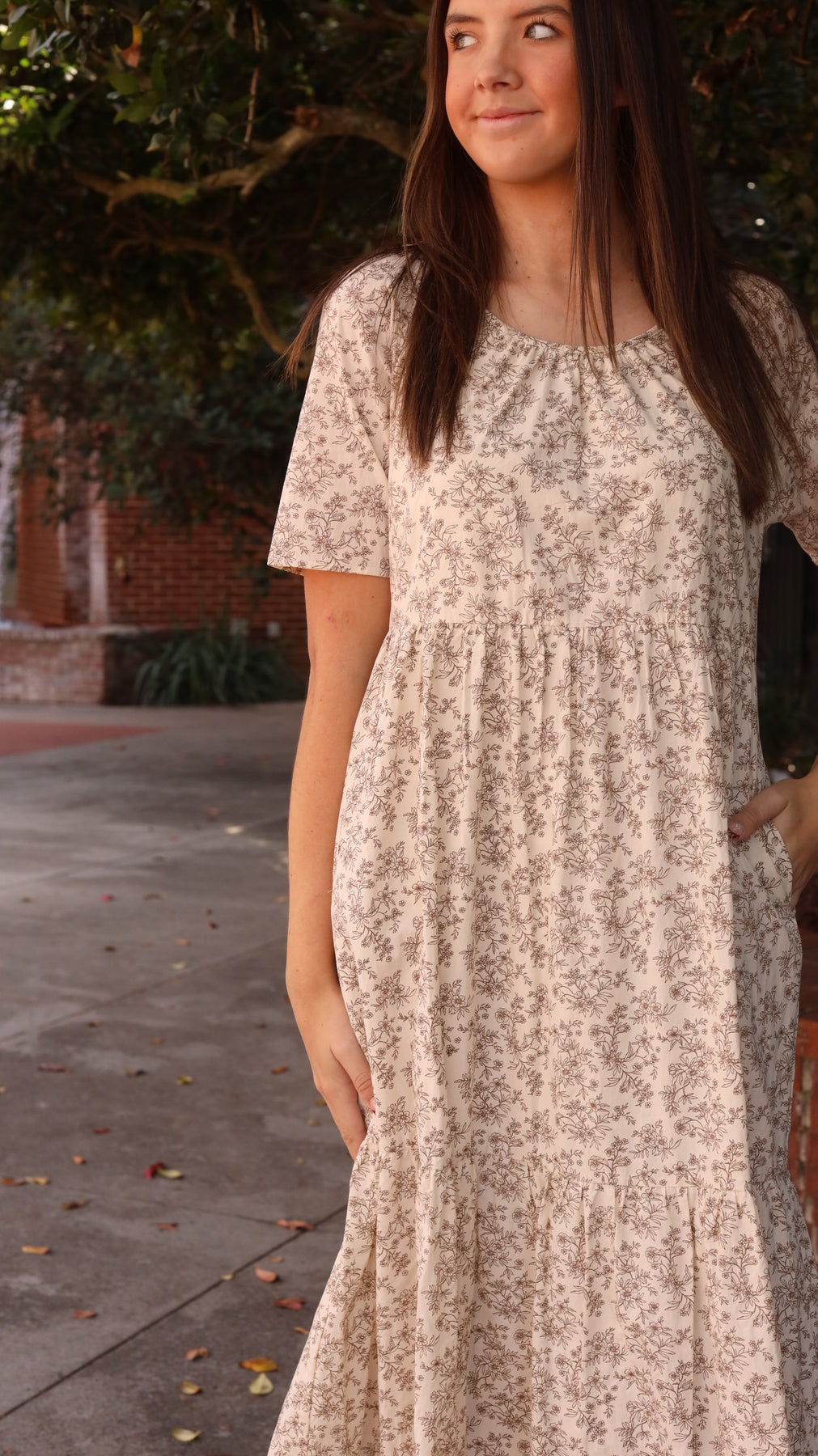 Regular price $57.99The Natasha Dress is an ideal choice for the changing of seasons. It features a wide round neckline and modest short sleeves. The high waistline is designed to comfortably accommodate a growing bump. With handy pockets included, this tiered maxi dress displays a beautiful brown floral pattern on a cream background. Whether you dress it up or keep it casual, it’s perfect for any occasion.