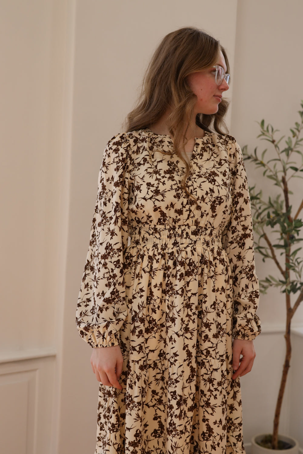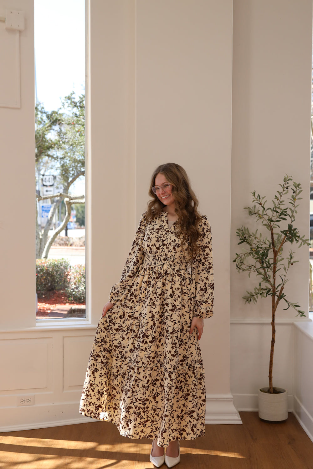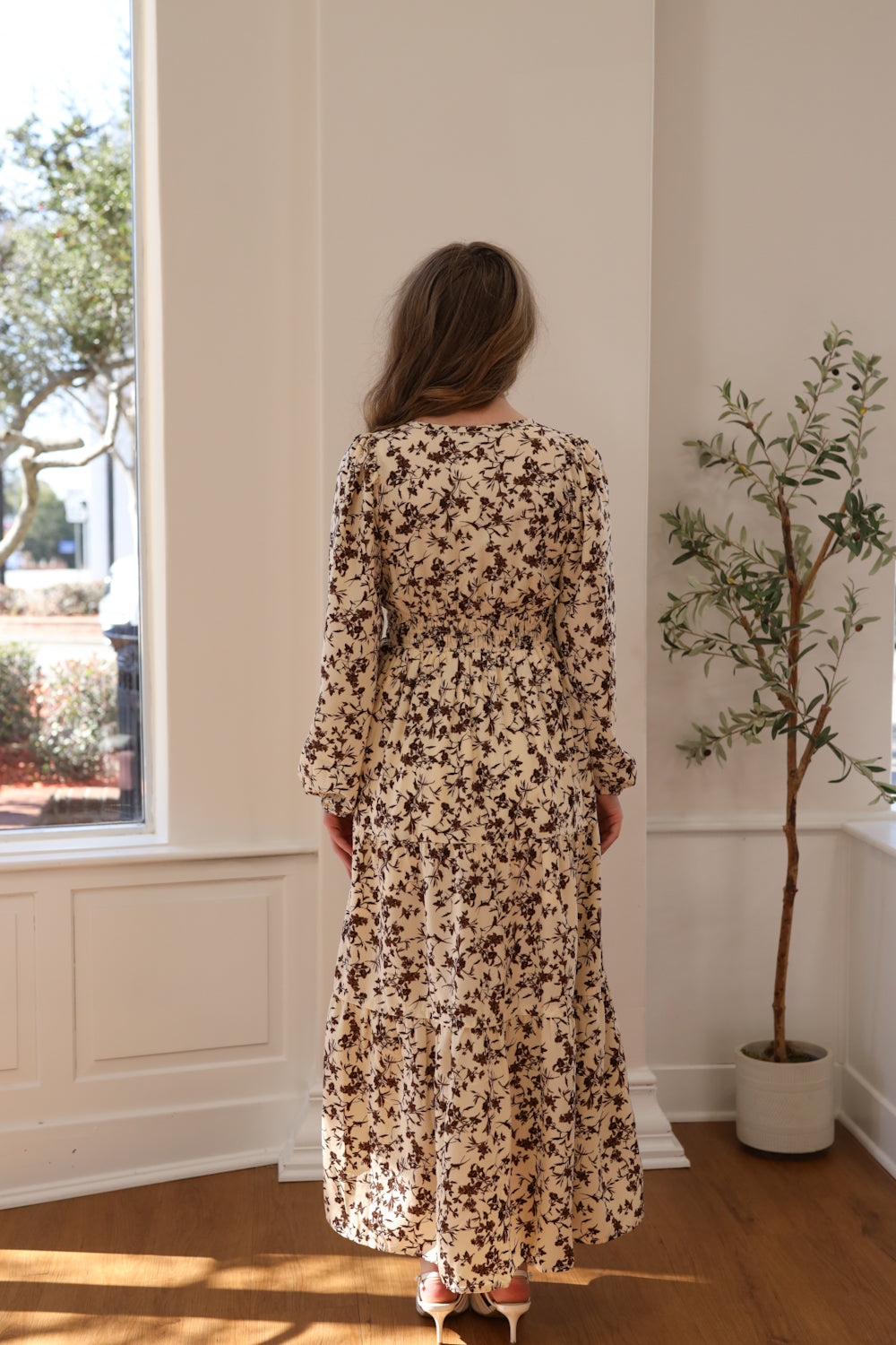 Regular price $59.99We're thrilled to bring back a timeless style in our new Allie Dress. This maxi dress features a flattering V-neckline and long puff sleeves with elastic cuffs that frame your shoulders beautifully. The high smocked waistline provides a comfortable, custom fit, while functional pockets keep your hands free. Tiered layers throughout the skirt create an effortless, flowing silhouette that moves with you. Dressed in a warm cream and brown floral print, this versatile dress is perfect for everything from Sunday attire to special gatherings.