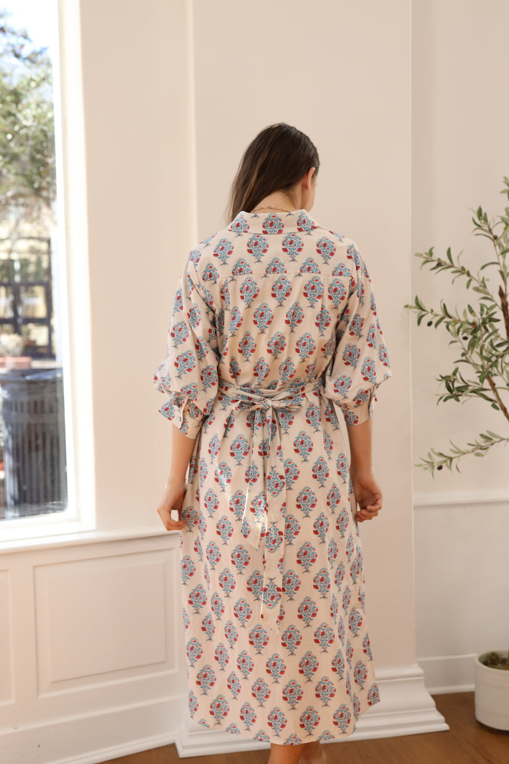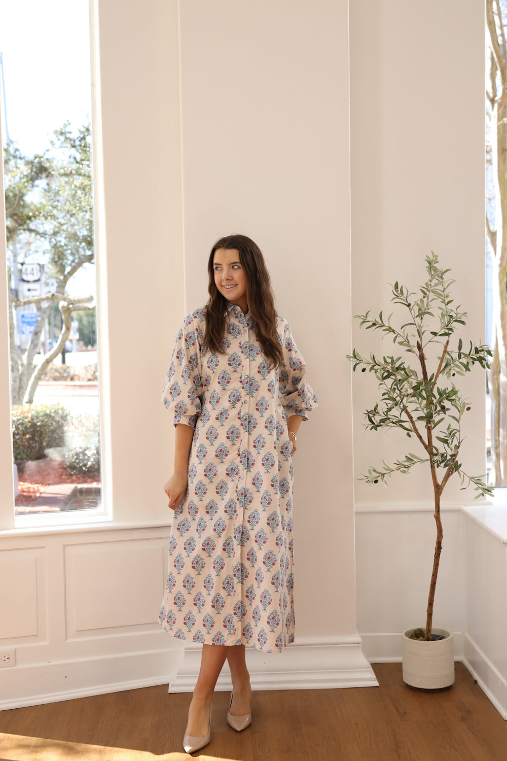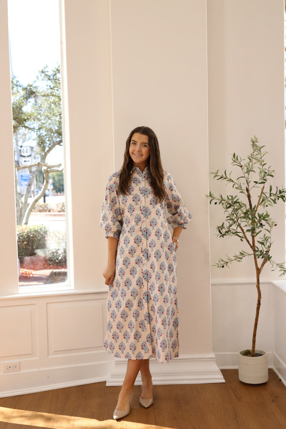Regular price $59.99The Harman Dress is a midi dress featuring a stunning floral print in soft blues and pinks on a warm ecru and beige foundation. The classic collared neckline and full-length button front provide nursing accessibility and intuitive styling, while the voluminous three-quarter sleeves with button cuffs add contemporary flair. A removable waist tie allows you to customize the fit, creating a gracefully defined silhouette whenever you desire. Practical pockets keep your essentials close at hand. Whether you're enjoying a relaxed outing with friends or simply embracing a more carefree aesthetic, this versatile dress supports your lifestyle with warmth and understated beauty.