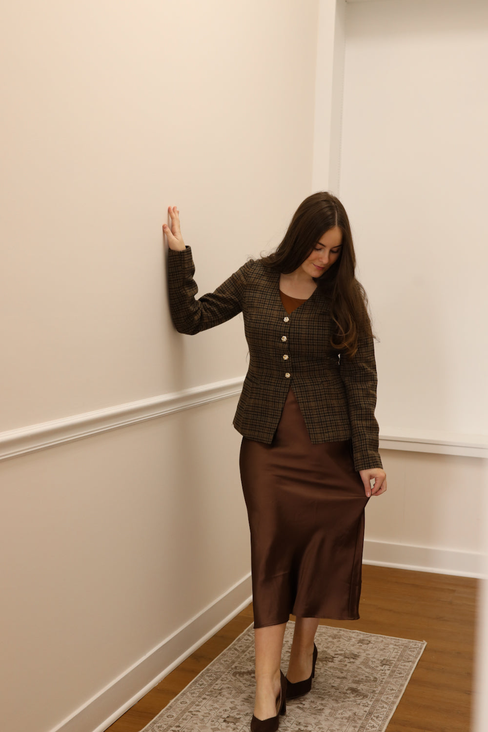 A back view of a model inside a room wearing a blazer and a brown satin skirt.