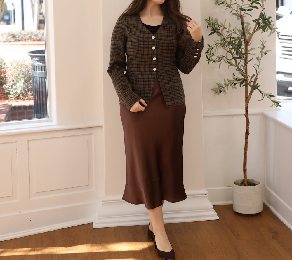 A model inside a room wearing a gold-button blazer and a brown satin skirt.