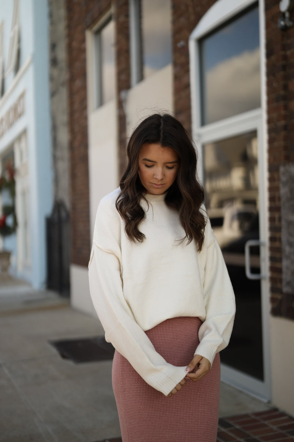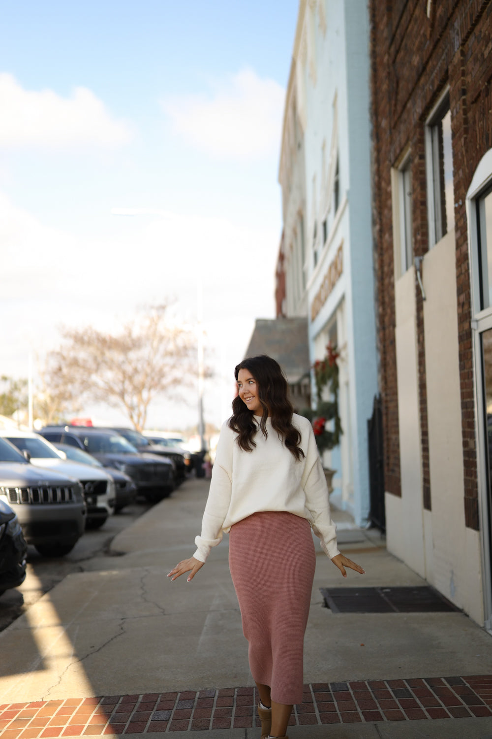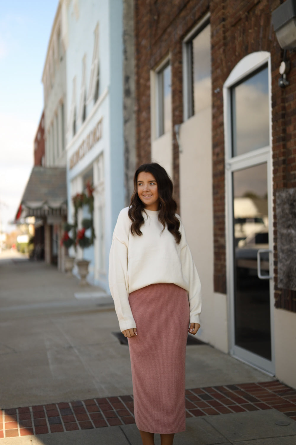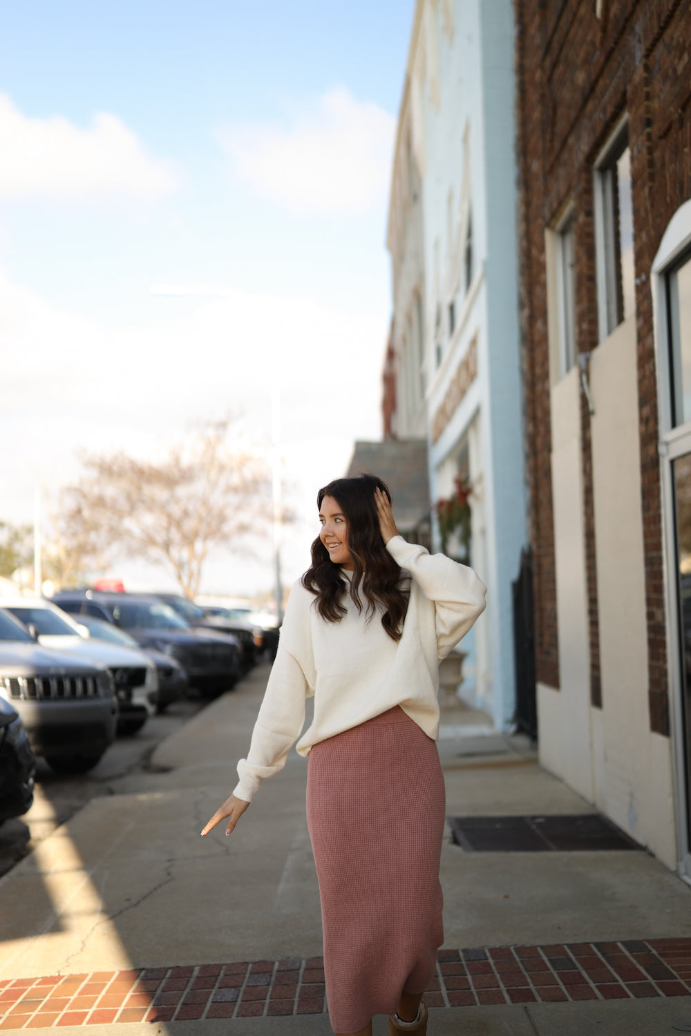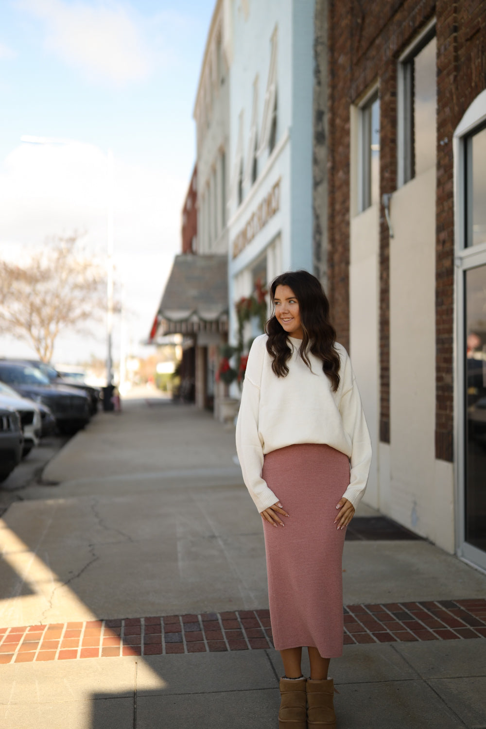 - Model is 5’9” without heels & she wears a small. She is wearing a small in this sweater. We paired it with our waffle sweater skirt in mauve.