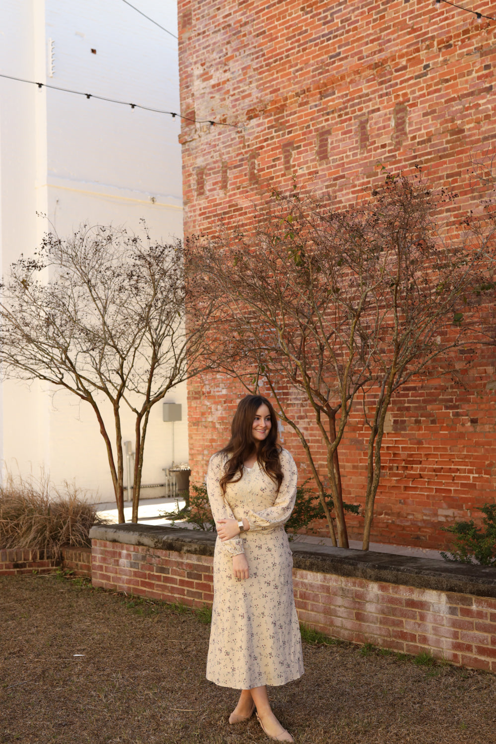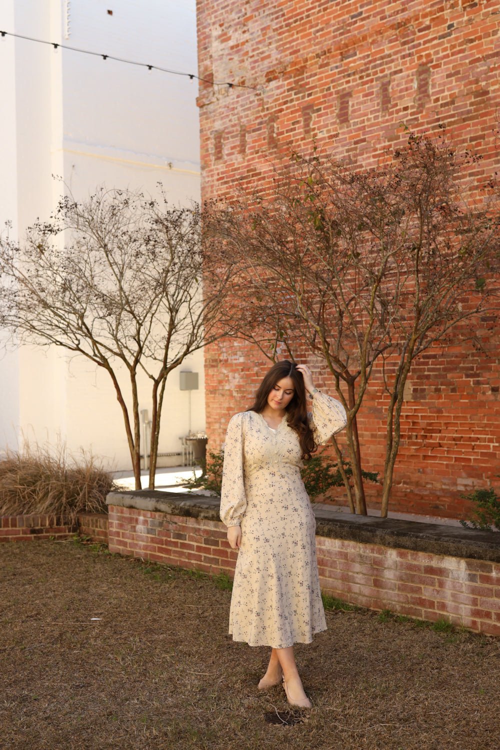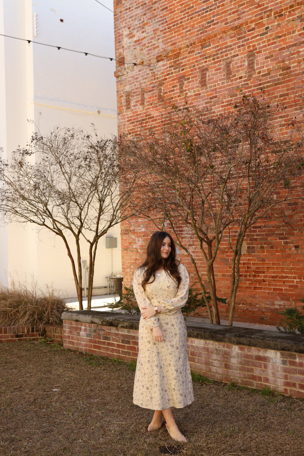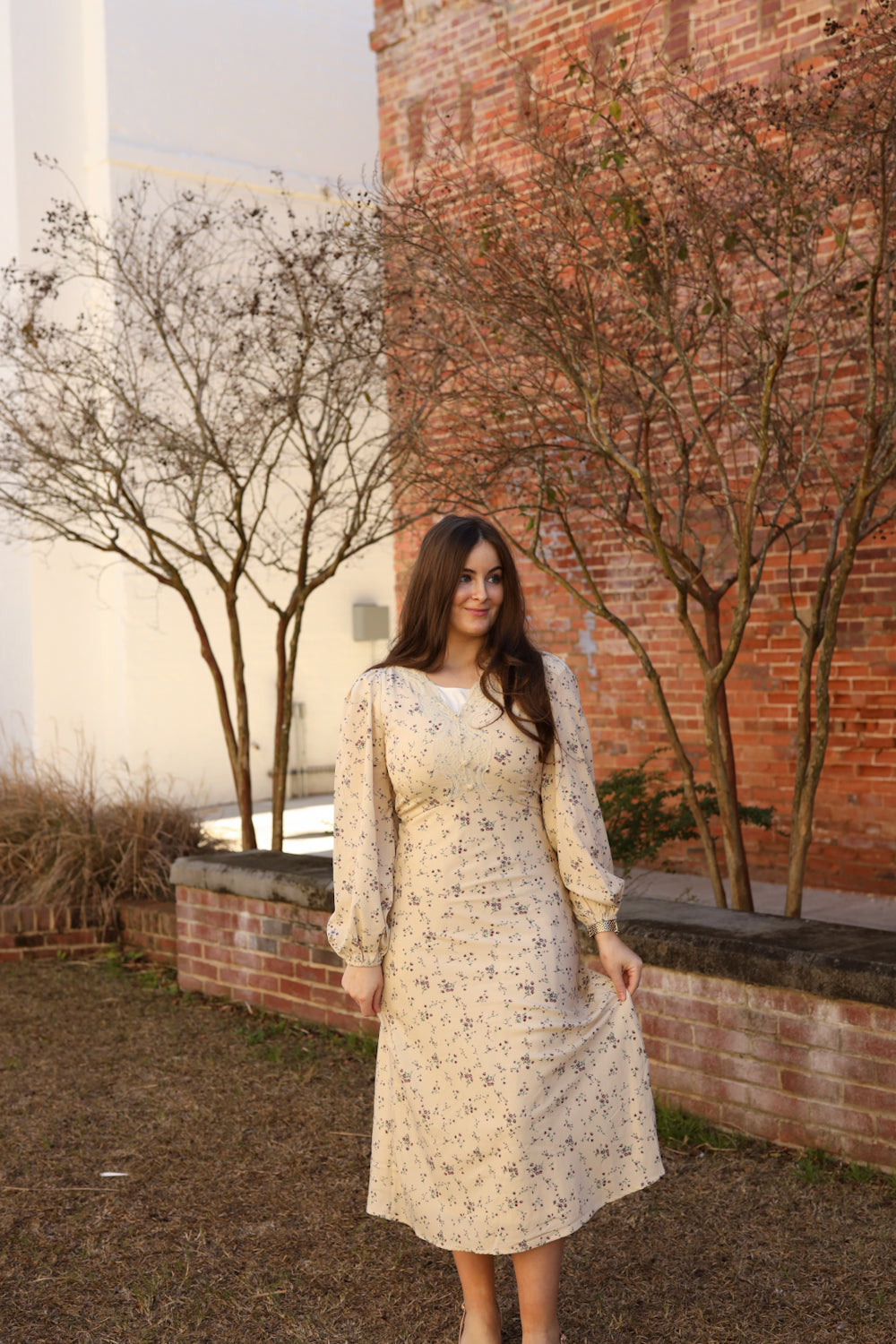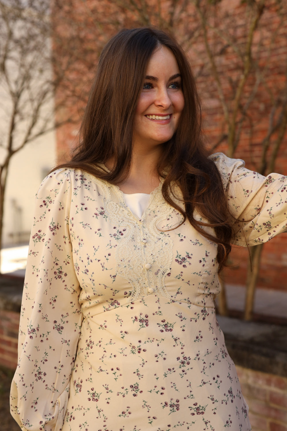The Madelyn Dress combines timeless elegance with charming vintage touches that make it a standout choice for special moments. This midi-length piece features a delicate lace-adorned bodice, graceful puff sleeves with generous volume, and a flattering empire waistline. The cream background showcases a beautiful lavender floral print, while a side zipper ensures easy wear. Decorative buttons accent the bodice, completing the vintage aesthetic. Whether you're attending a wedding, celebration, or formal event, this dress brings sophistication and character to your wardrobe.