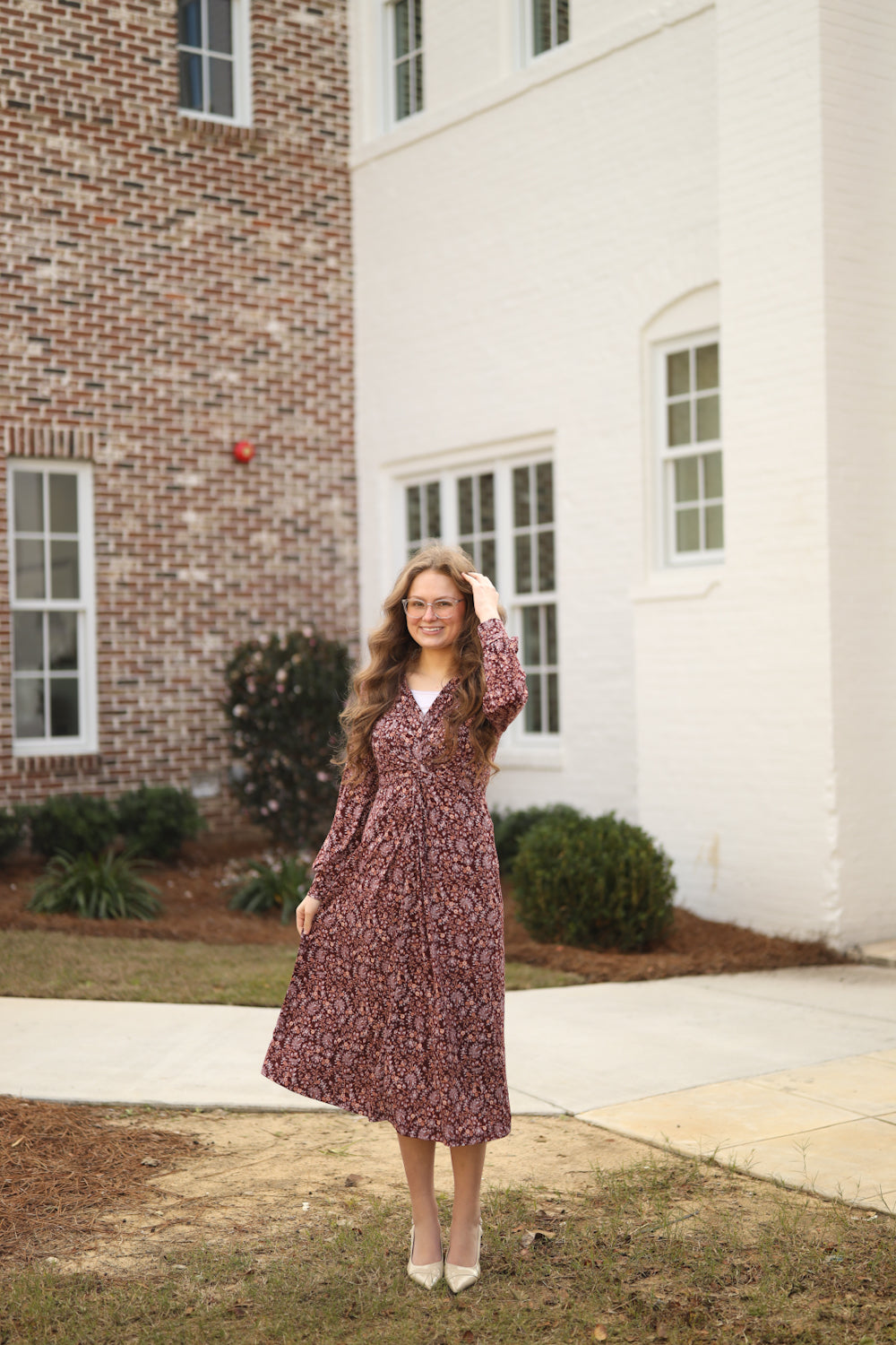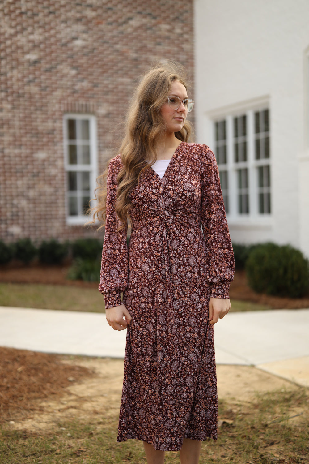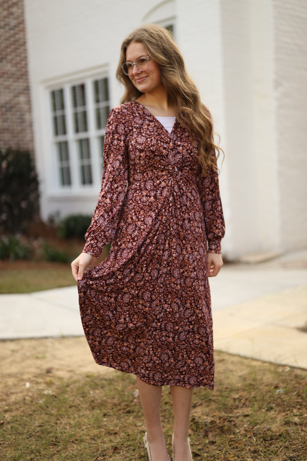 Regular price $56.99The Marcie Dress is crafted to help you feel your best at every moment. This midi-length dress showcases a vibrant multicolored floral design beautifully set against a rich maroon tone. A graceful V-neckline is enhanced with a knotted detail at the bodice, while long sleeves with simple cuff accents provide elegant finishing touches. The empire waistline allows the dress to accommodate mommies-to-be. From celebrations to everyday wear, this dress combines effortless style with the comfort you deserve.