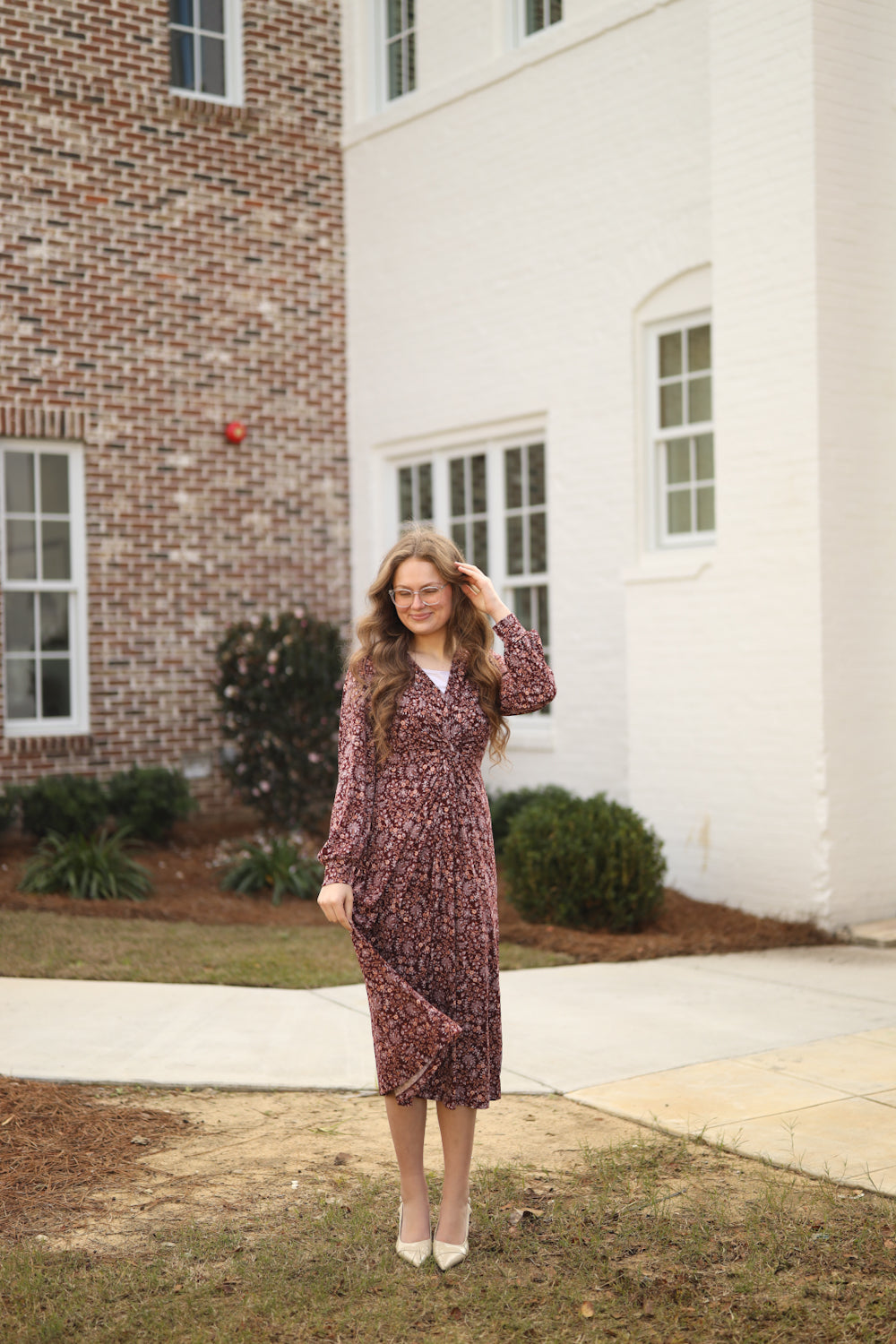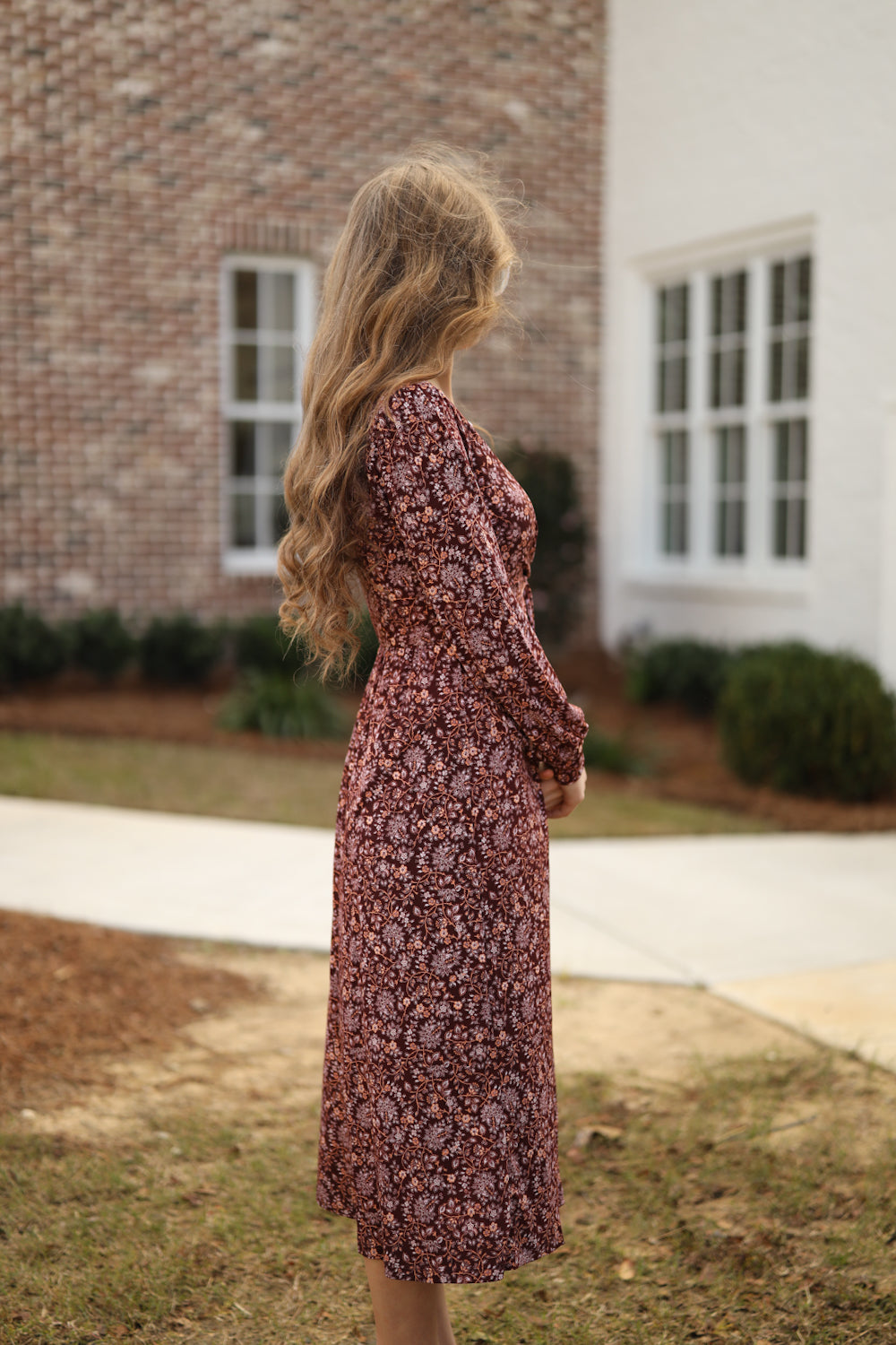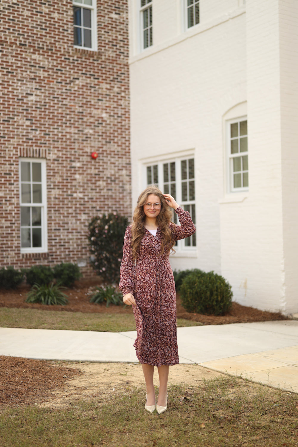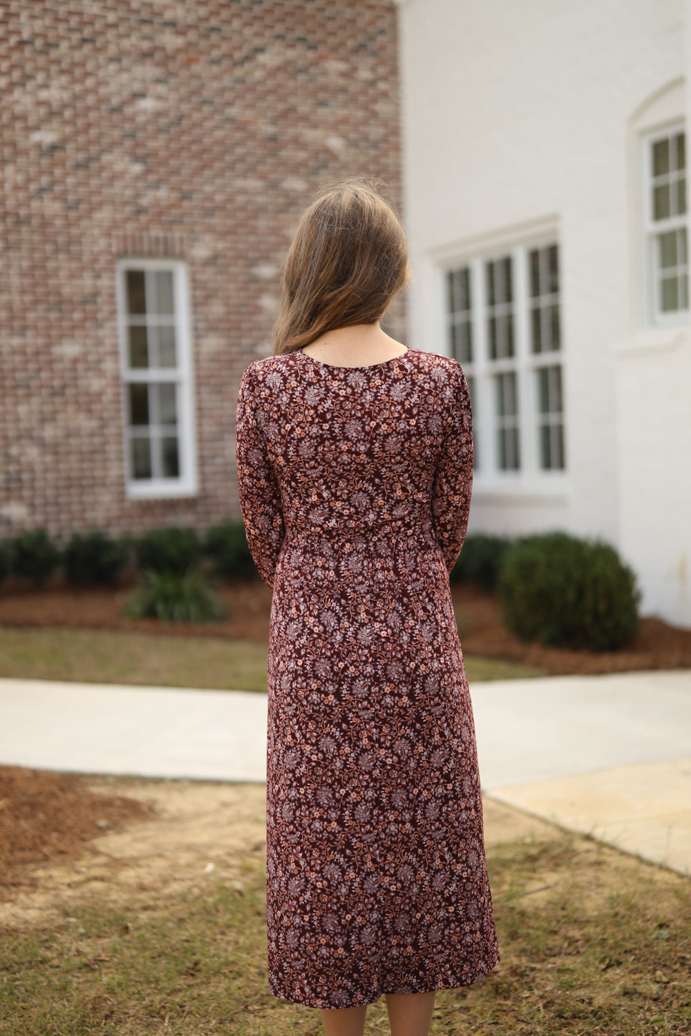 Regular price $56.99The Marcie Dress is crafted to help you feel your best at every moment. This midi-length dress showcases a vibrant multicolored floral design beautifully set against a rich maroon tone. A graceful V-neckline is enhanced with a knotted detail at the bodice, while long sleeves with simple cuff accents provide elegant finishing touches. The empire waistline allows the dress to accommodate mommies-to-be. From celebrations to everyday wear, this dress combines effortless style with the comfort you deserve.