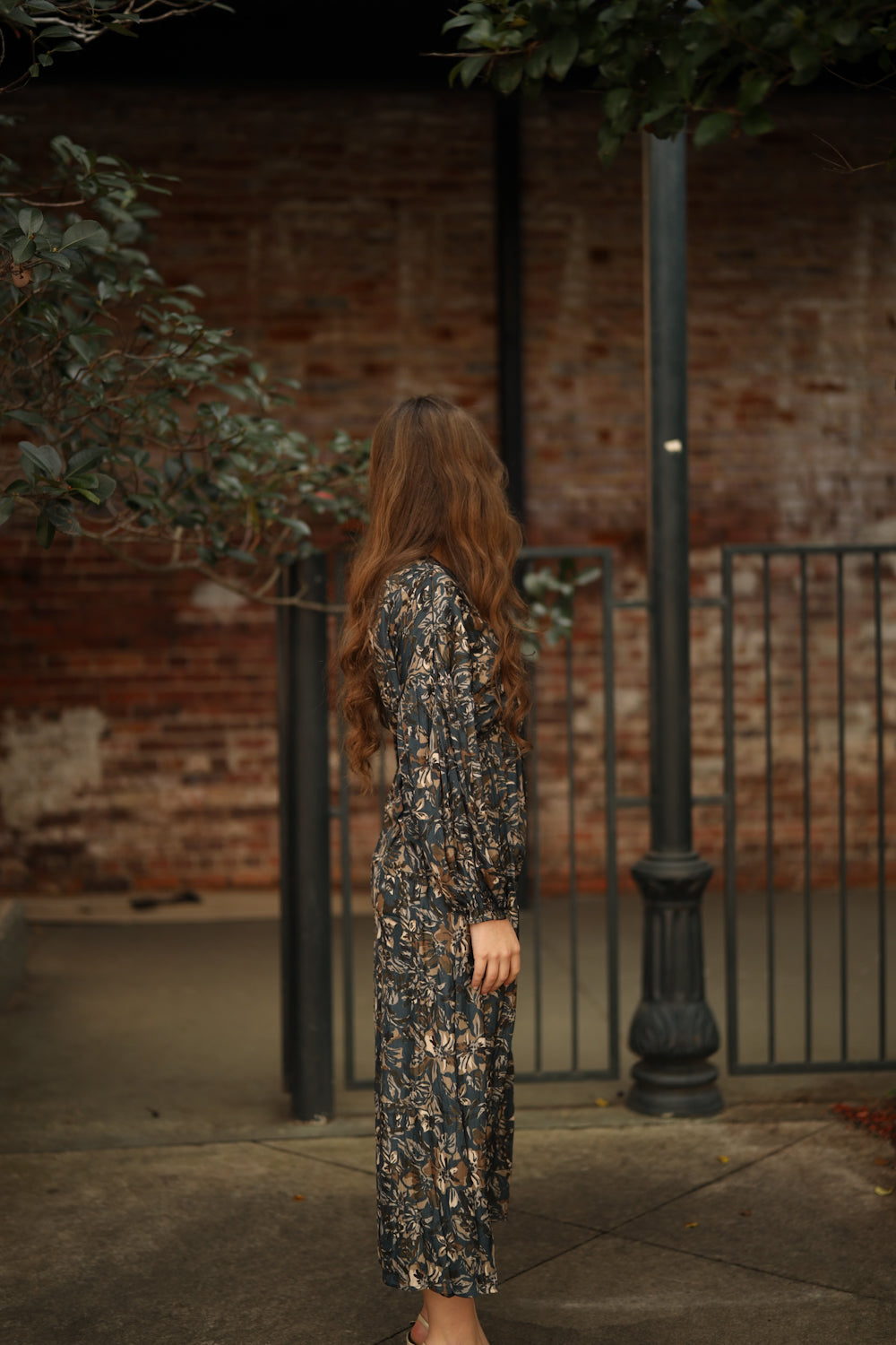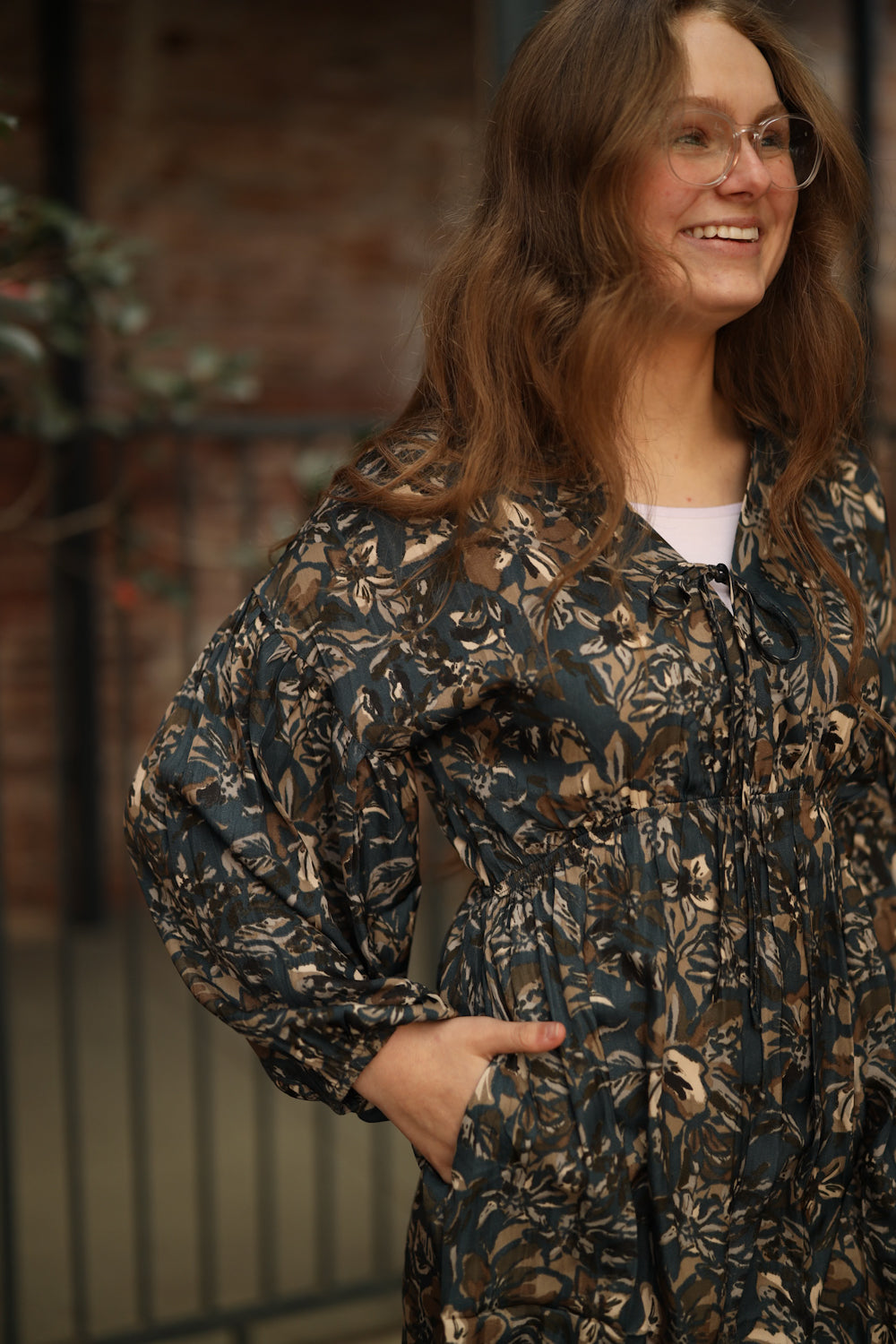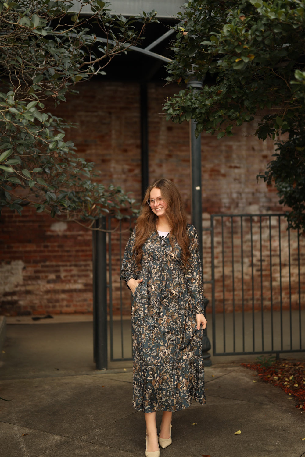 Regular price $72.99The Micah Dress brings together elegance and practicality for your most important moments. This breathtaking maxi dress is crafted from a navy teal print on luxurious silky satin that drapes beautifully, featuring a flattering V-neckline with a charming tie accent. The elastic empire waistline offers gentle support and grows with you, making it ideal for pregnancy and beyond. Dramatic voluminous sleeves with a relaxed drop shoulder design and elastic cuffs create movement and grace, while functional pockets add everyday convenience. Whether you're attending a wedding, celebration, or special event, this dress helps you feel radiant, supported, and absolutely stunning.