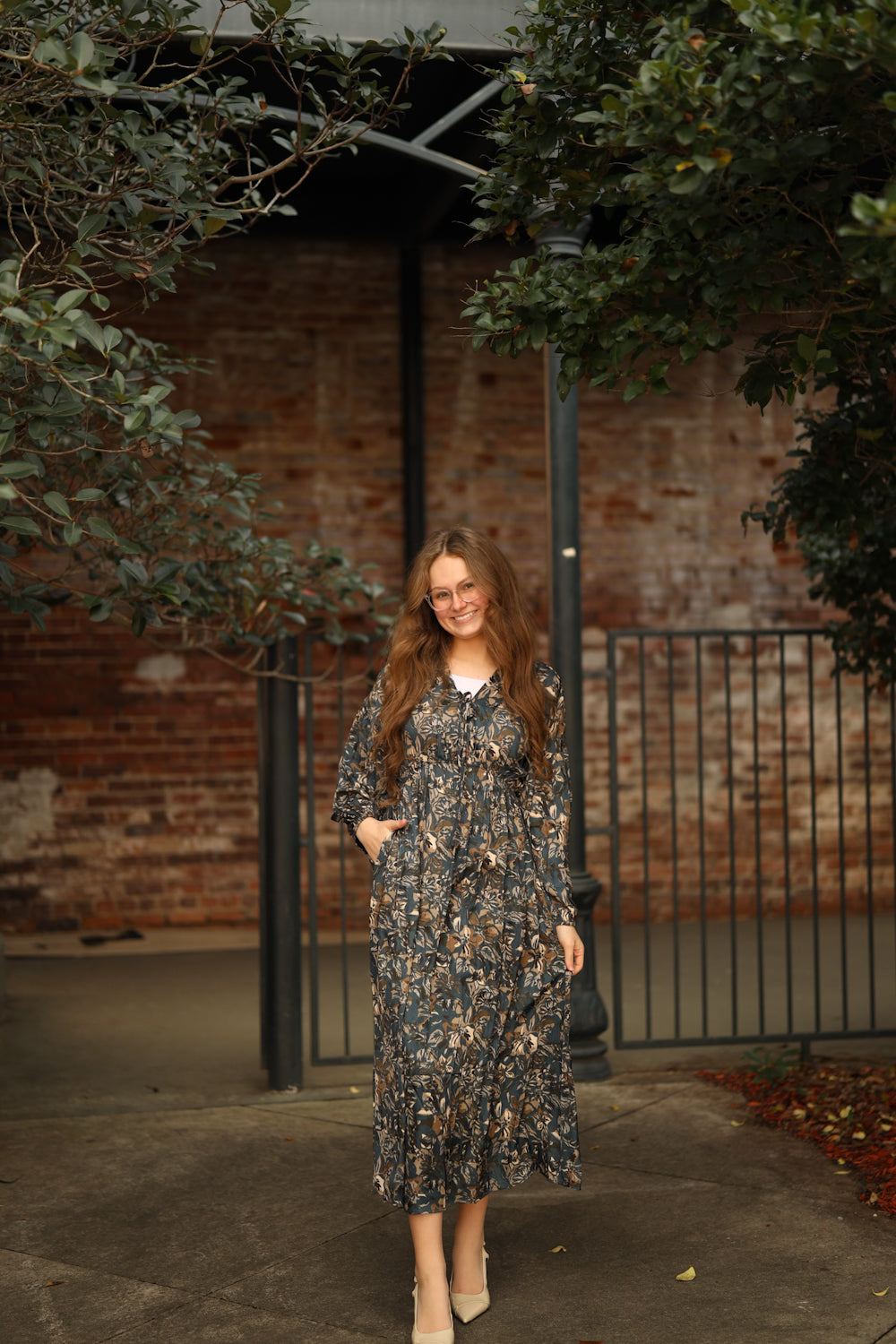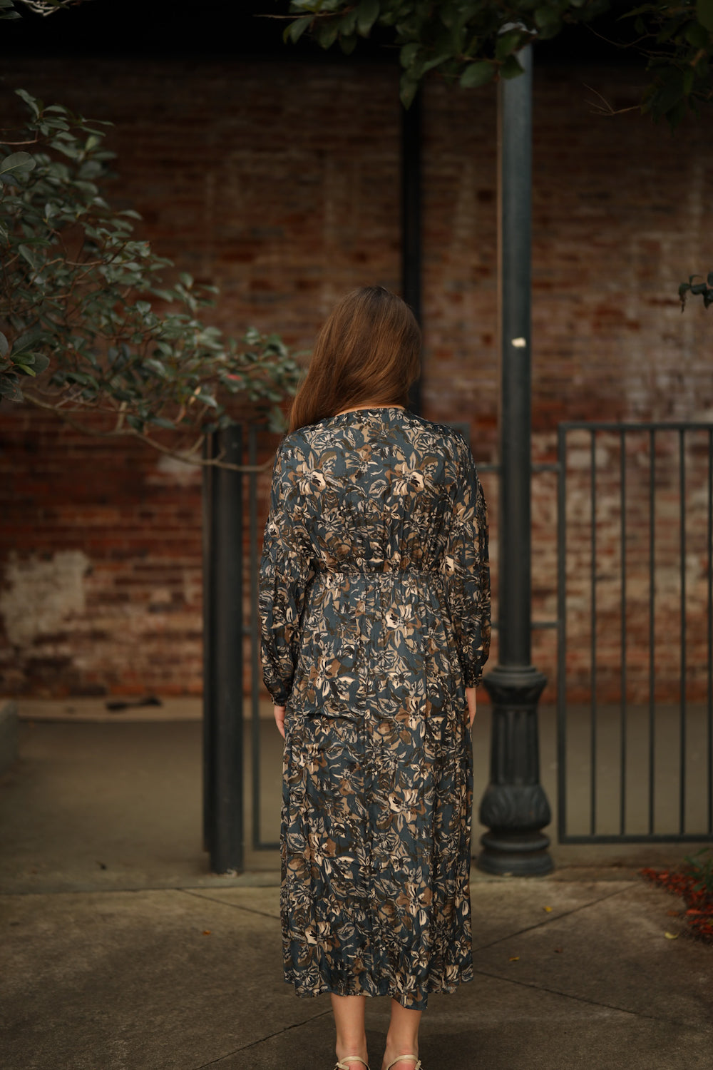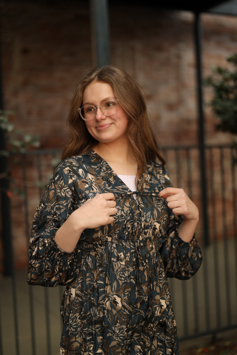 Regular price $72.99The Micah Dress brings together elegance and practicality for your most important moments. This breathtaking maxi dress is crafted from a navy teal print on luxurious silky satin that drapes beautifully, featuring a flattering V-neckline with a charming tie accent. The elastic empire waistline offers gentle support and grows with you, making it ideal for pregnancy and beyond. Dramatic voluminous sleeves with a relaxed drop shoulder design and elastic cuffs create movement and grace, while functional pockets add everyday convenience. Whether you're attending a wedding, celebration, or special event, this dress helps you feel radiant, supported, and absolutely stunning.