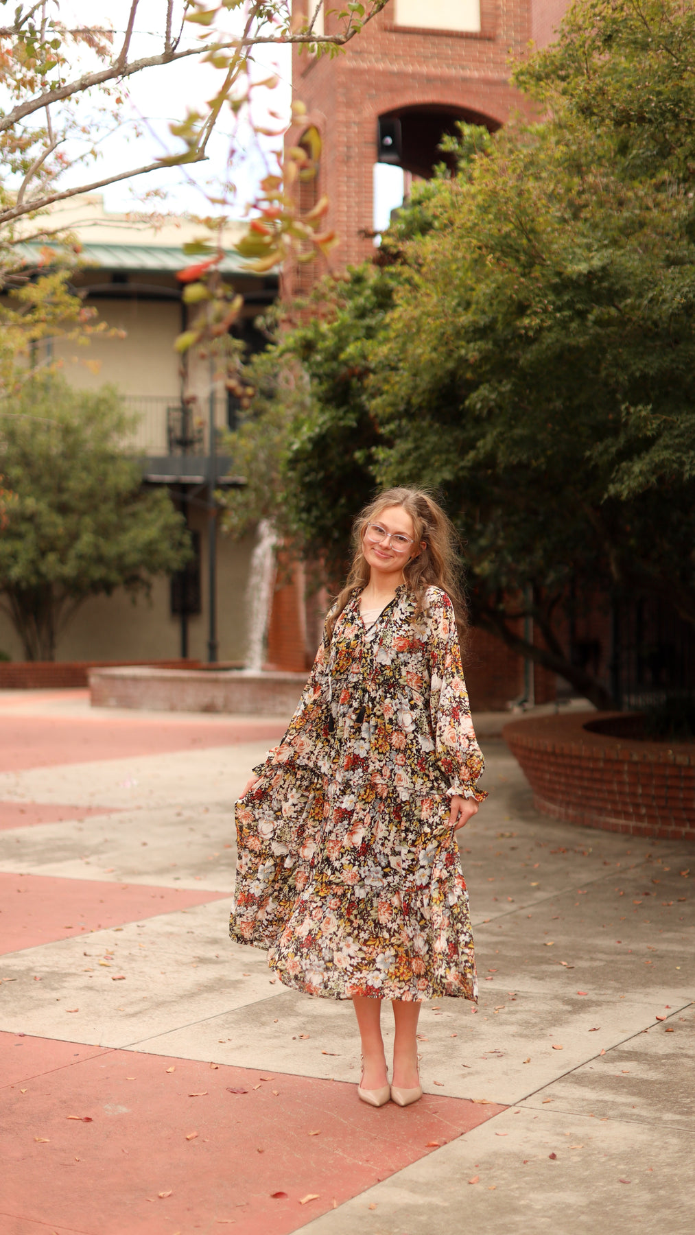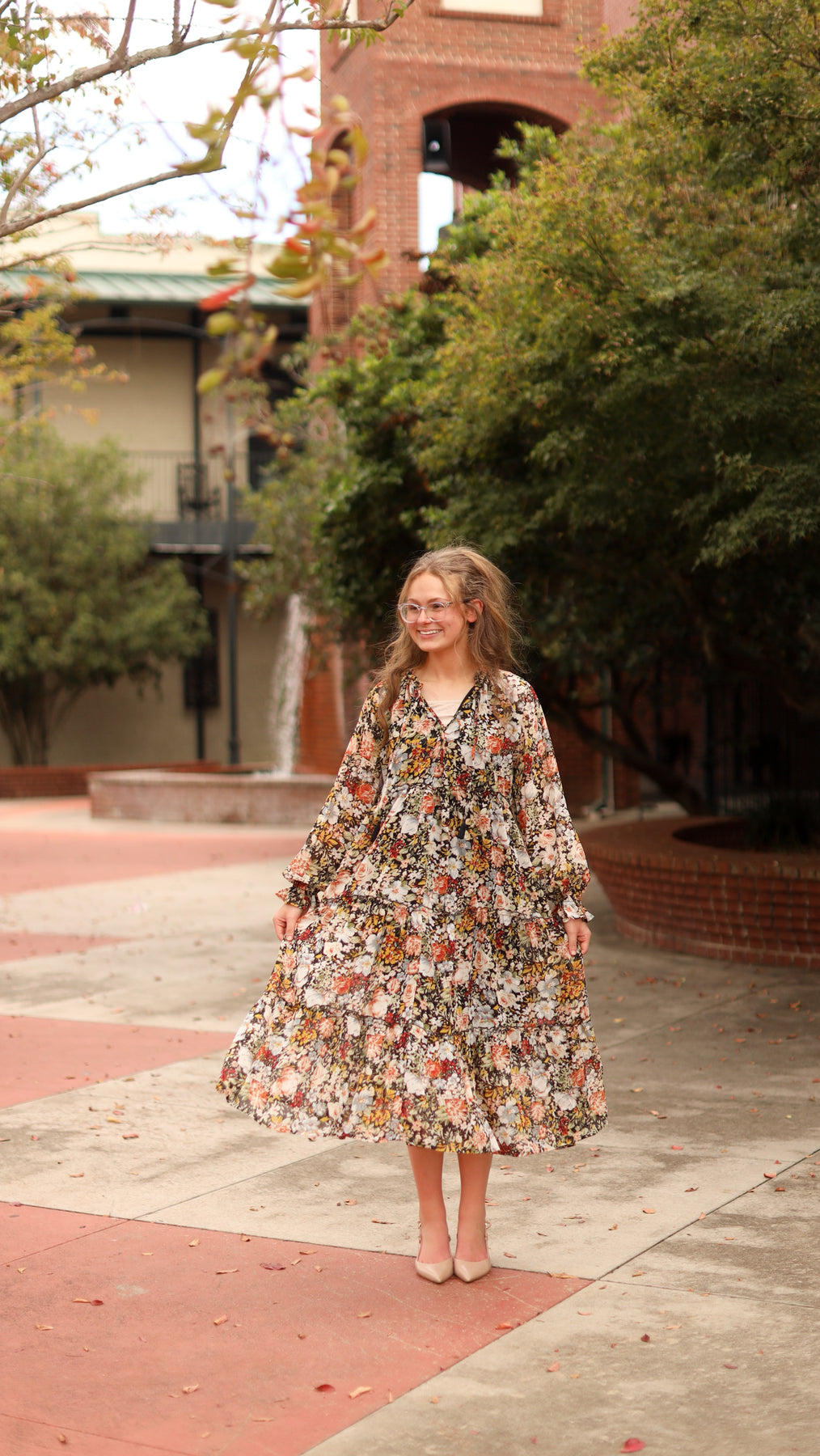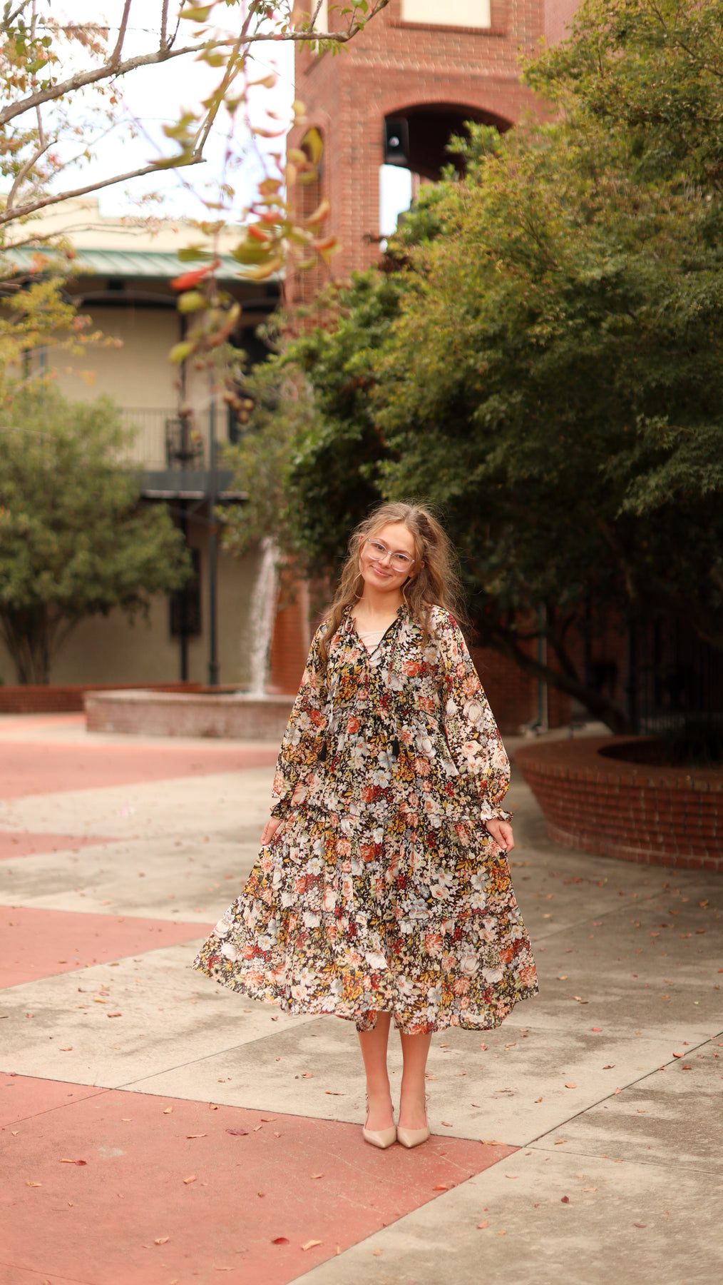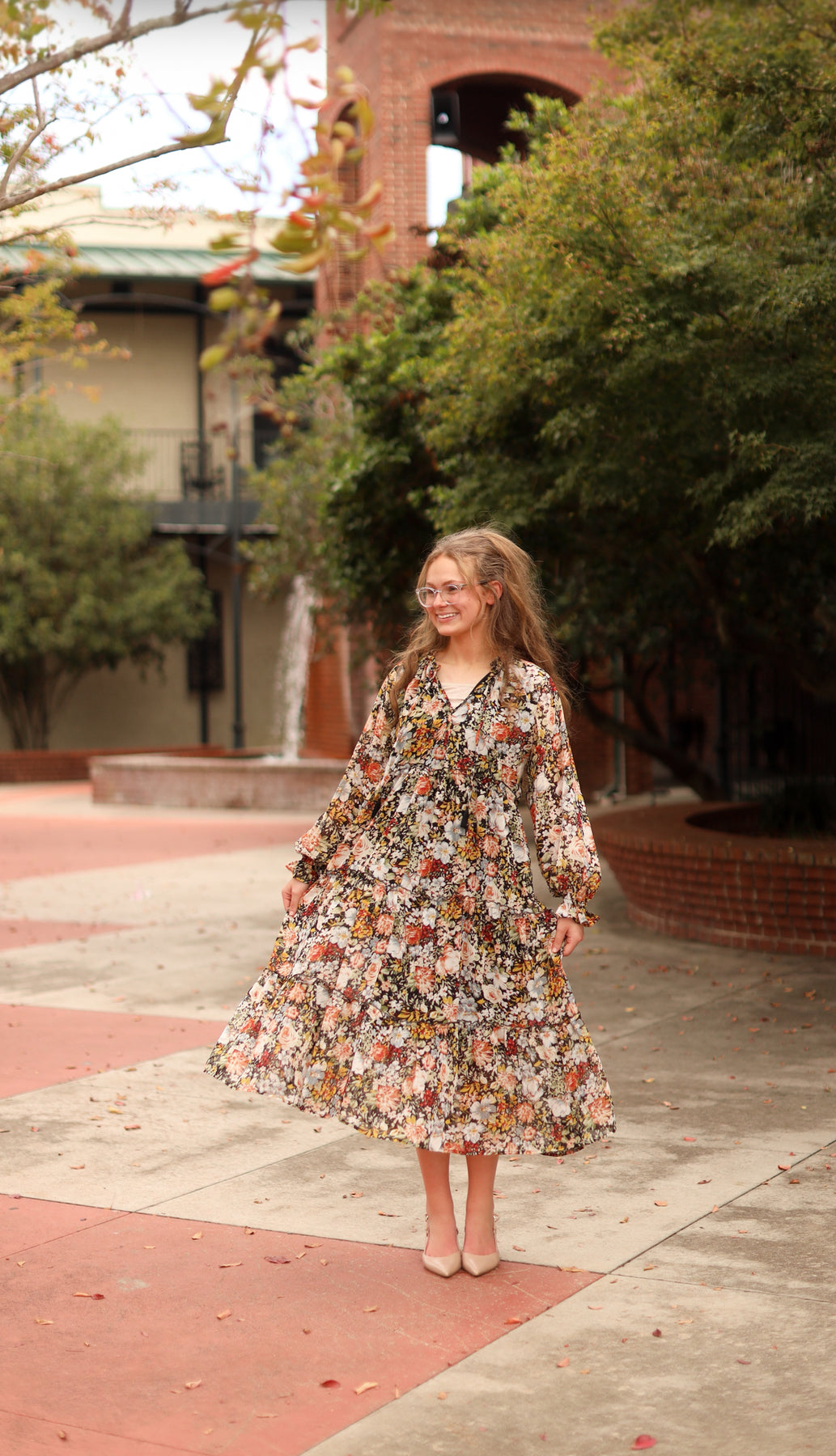 Regular price $62.99Find your ideal outfit for family fall photos with our Kensington Floral Dress. This midi dress showcases a charming floral pattern in warm autumn hues on a black background. It features a round neckline adorned with ruffles and a front keyhole with a functional tie closure. The long sleeves include elastic cuffs and ruffle accents, while the high waistline accommodates maternity comfortably. Ruffle details highlight each tier, and the dress is fully lined except for the sleeves. A stylish and versatile choice to elevate your wardrobe this season.