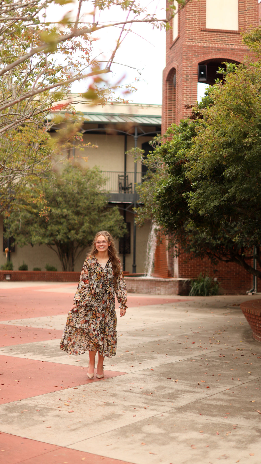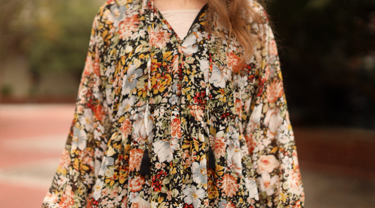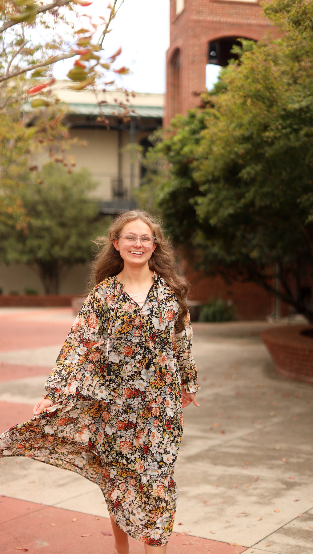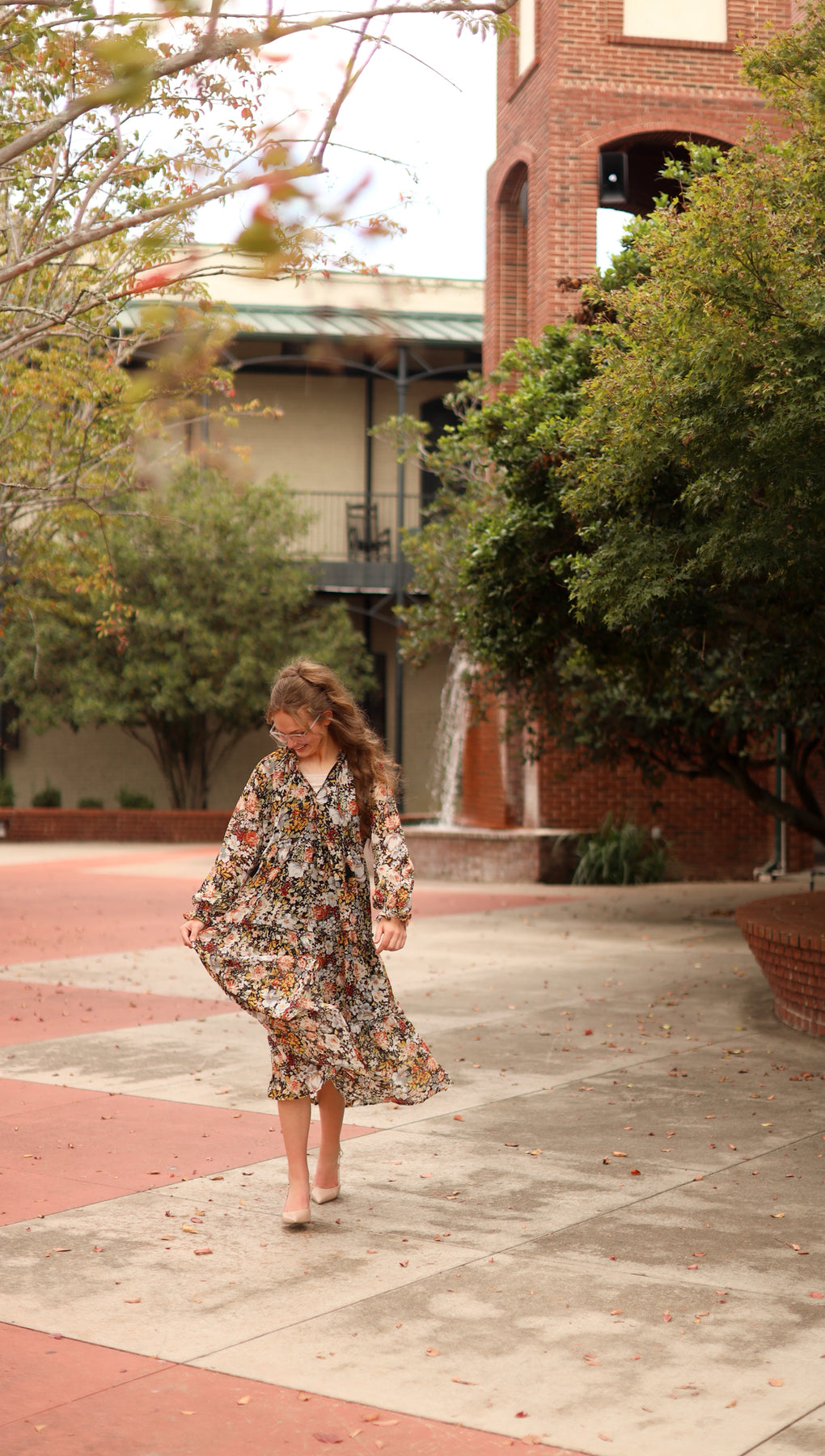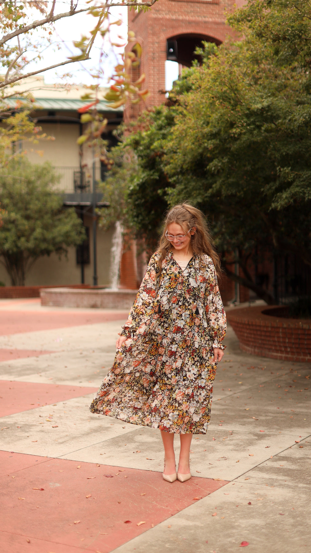 Regular price $62.99Find your ideal outfit for family fall photos with our Kensington Floral Dress. This midi dress showcases a charming floral pattern in warm autumn hues on a black background. It features a round neckline adorned with ruffles and a front keyhole with a functional tie closure. The long sleeves include elastic cuffs and ruffle accents, while the high waistline accommodates maternity comfortably. Ruffle details highlight each tier, and the dress is fully lined except for the sleeves. A stylish and versatile choice to elevate your wardrobe this season.