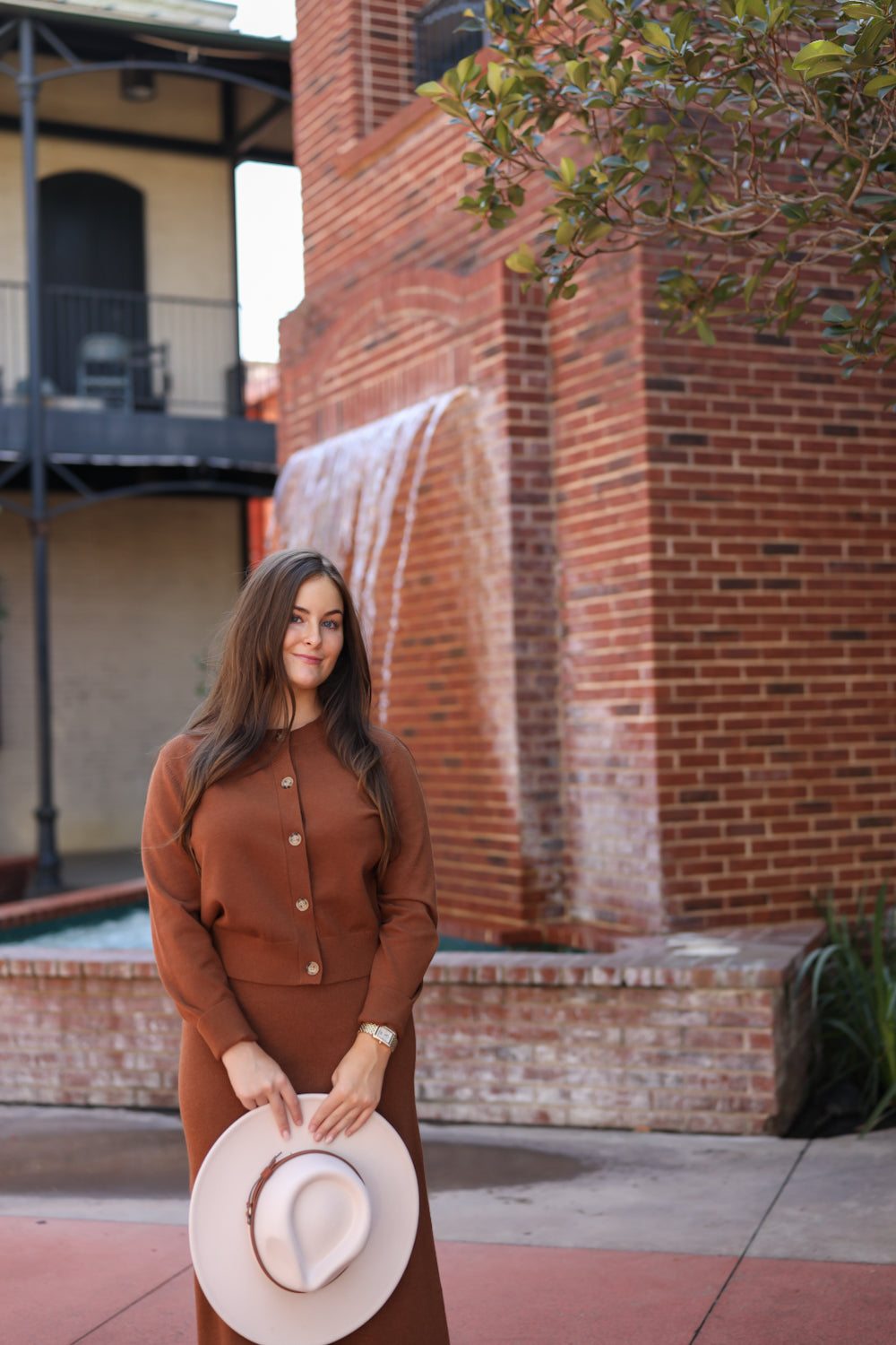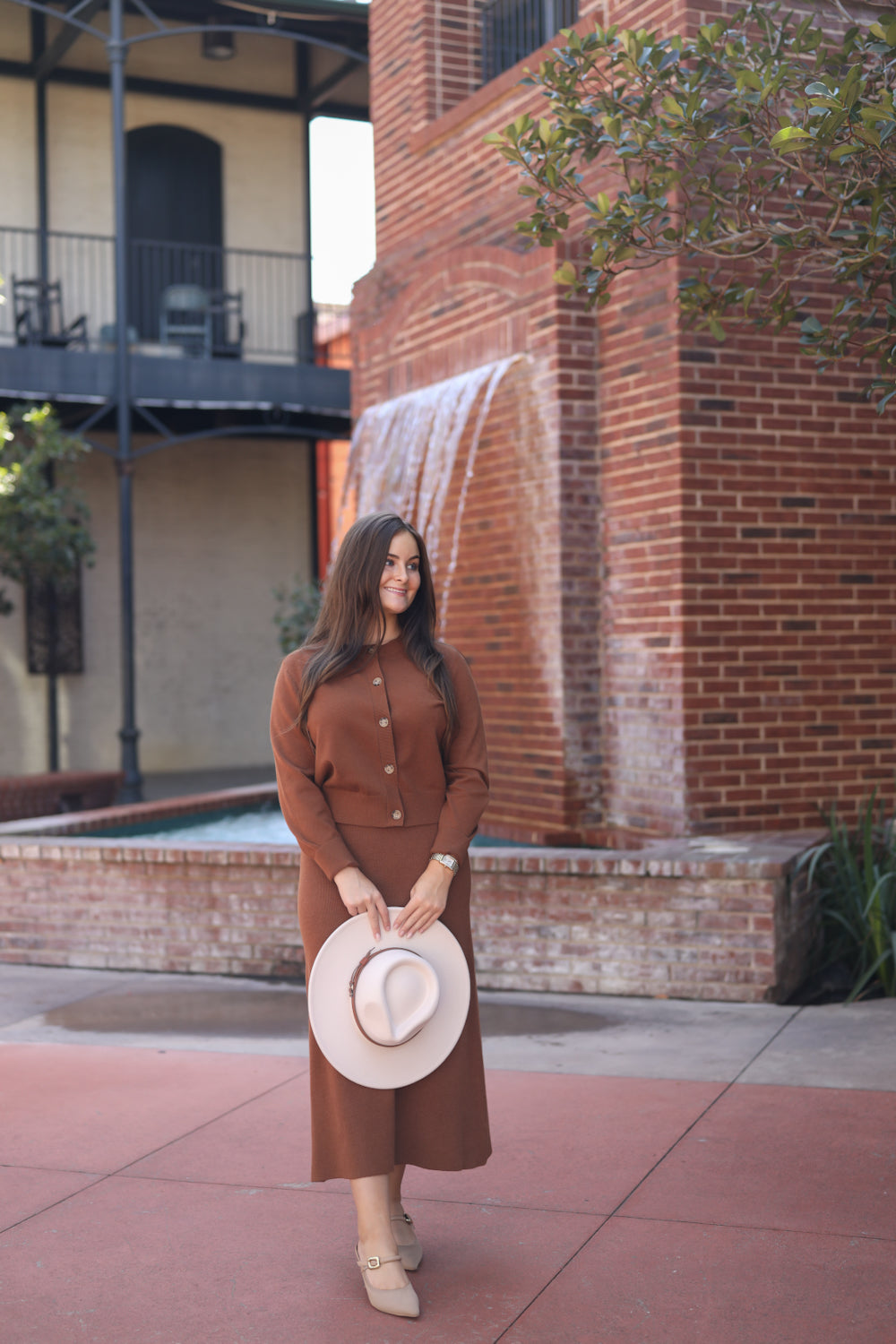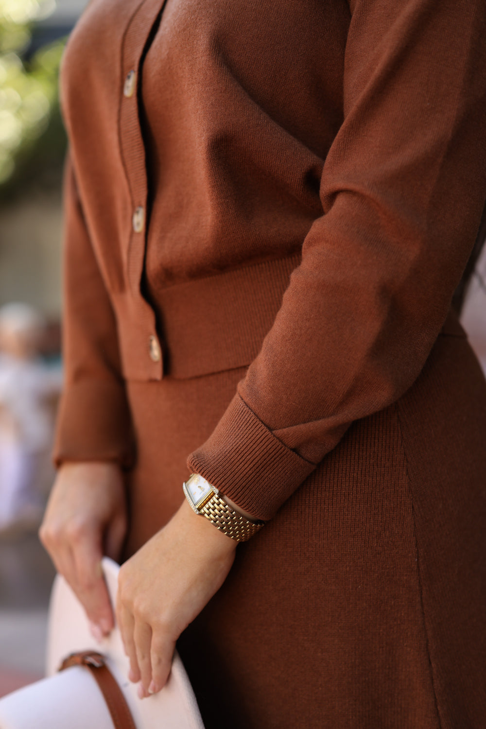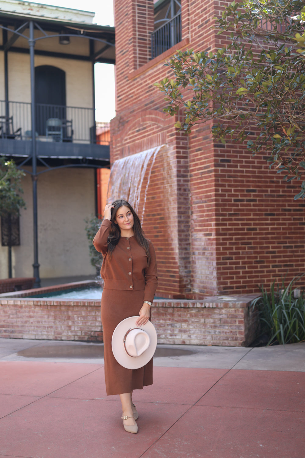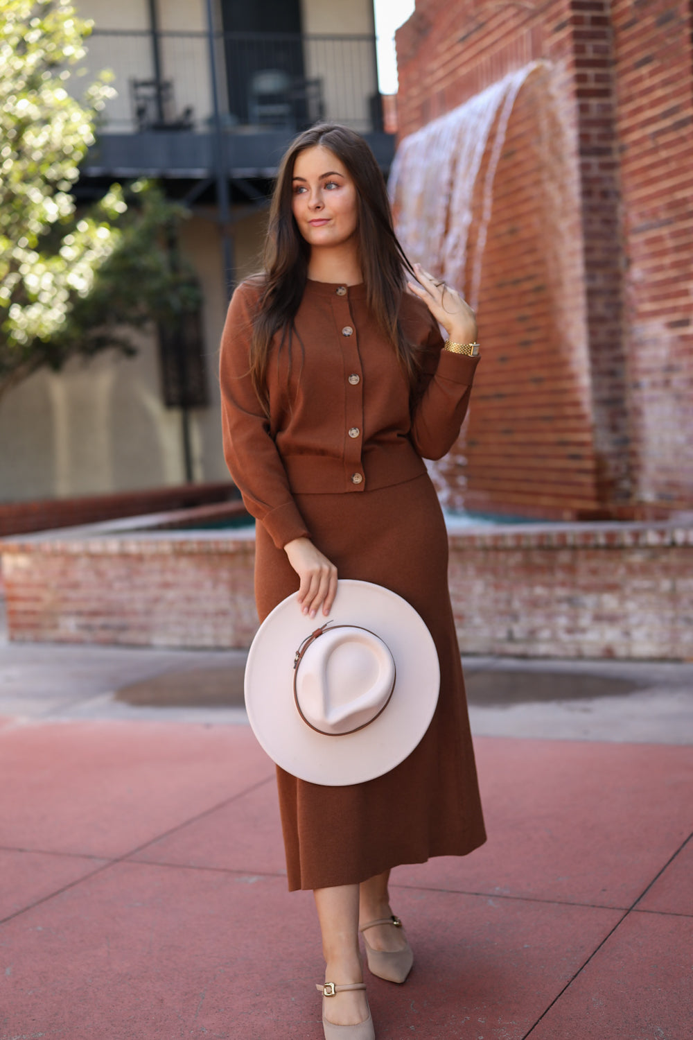 - Model wearing the brown is 5’6" & wears a M/L. She is wearing a large in the cardigan and an XL in the skirt.