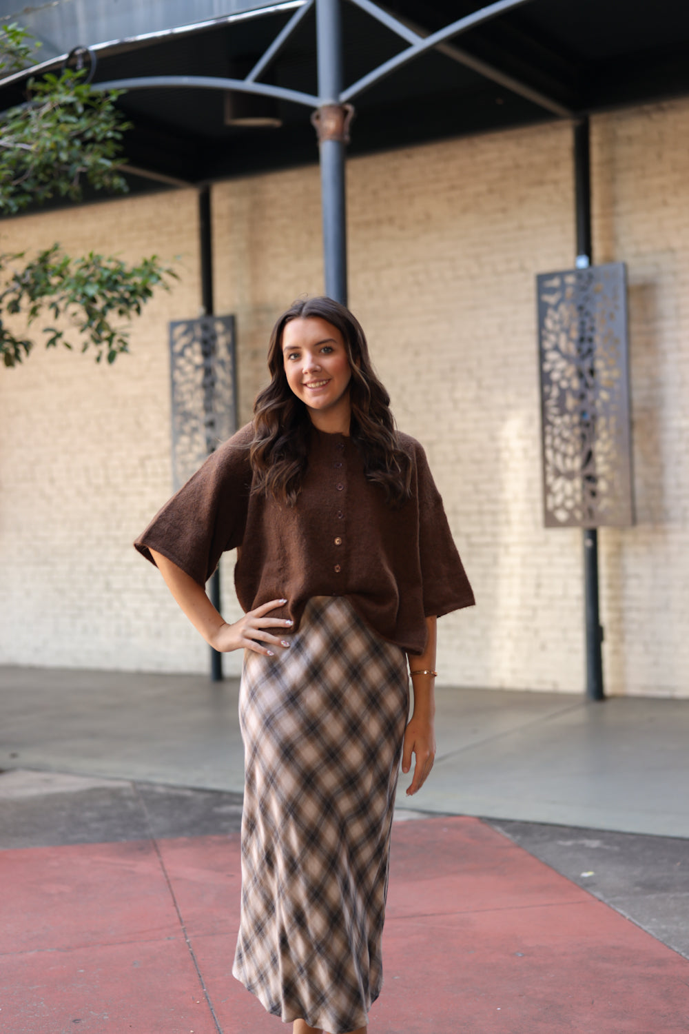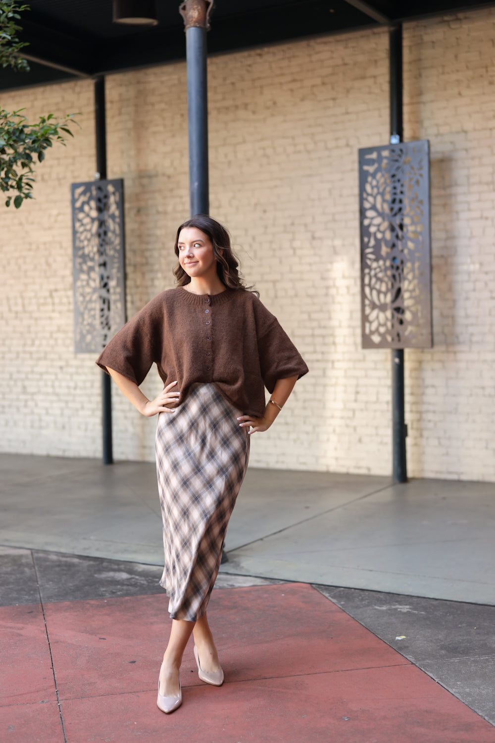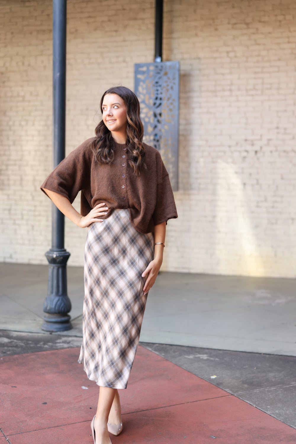 Regular price $52.99The Melba Skirt is a gorgeous choice for the fall season! Featuring a midi length and a charming plaid pattern in cream, taupe, and gray shades, this skirt is both elegant and versatile. It easily transitions from casual to dressy looks, making it a wonderful addition to your wardrobe.